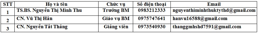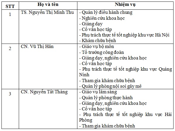 -Đảm bảo chất lượng đào tạo: xây dựng, bổ sung chương trình đào tạo; biên soạn giáo trình, bài giảng, bộ công cụ đánh giá học tập; phối hợp với các khoa/phòng/bộ môn trong quản lý dạy học, quản lý học sinh sinh viên nhằm nâng cao và giữ vững chất lượng đào tạo; phối hợp với các bệnh viện, cơ sở thực tế trong đào tạo HSSV.