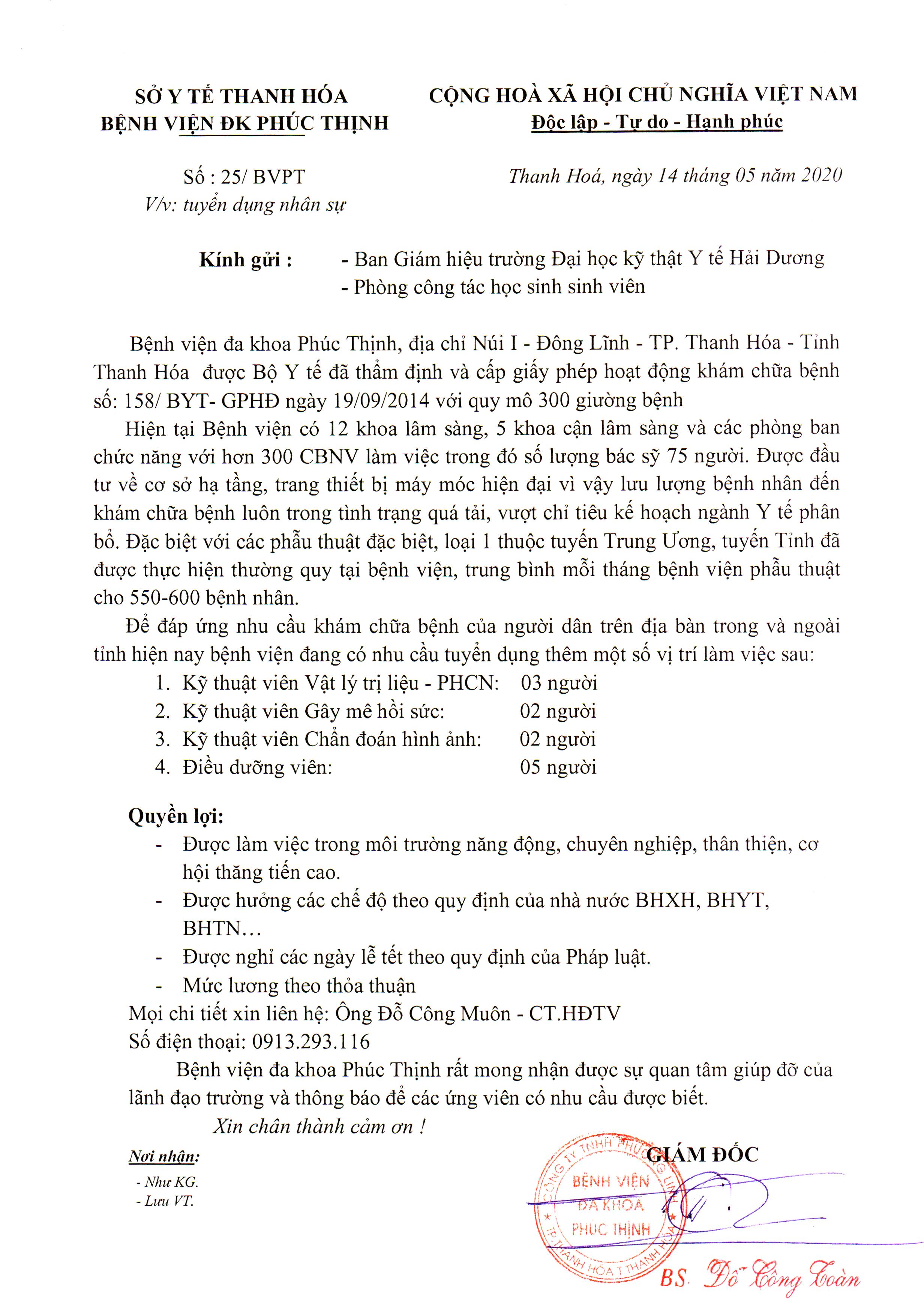 Bệnh viện đa khoa Phúc Thịnh - Thanh Hóa tuyển dụng