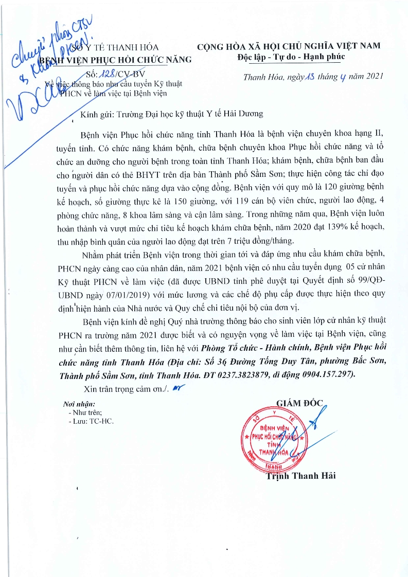 Tuyên dụng của Bệnh viện PHCN tỉnh Thanh Hóa