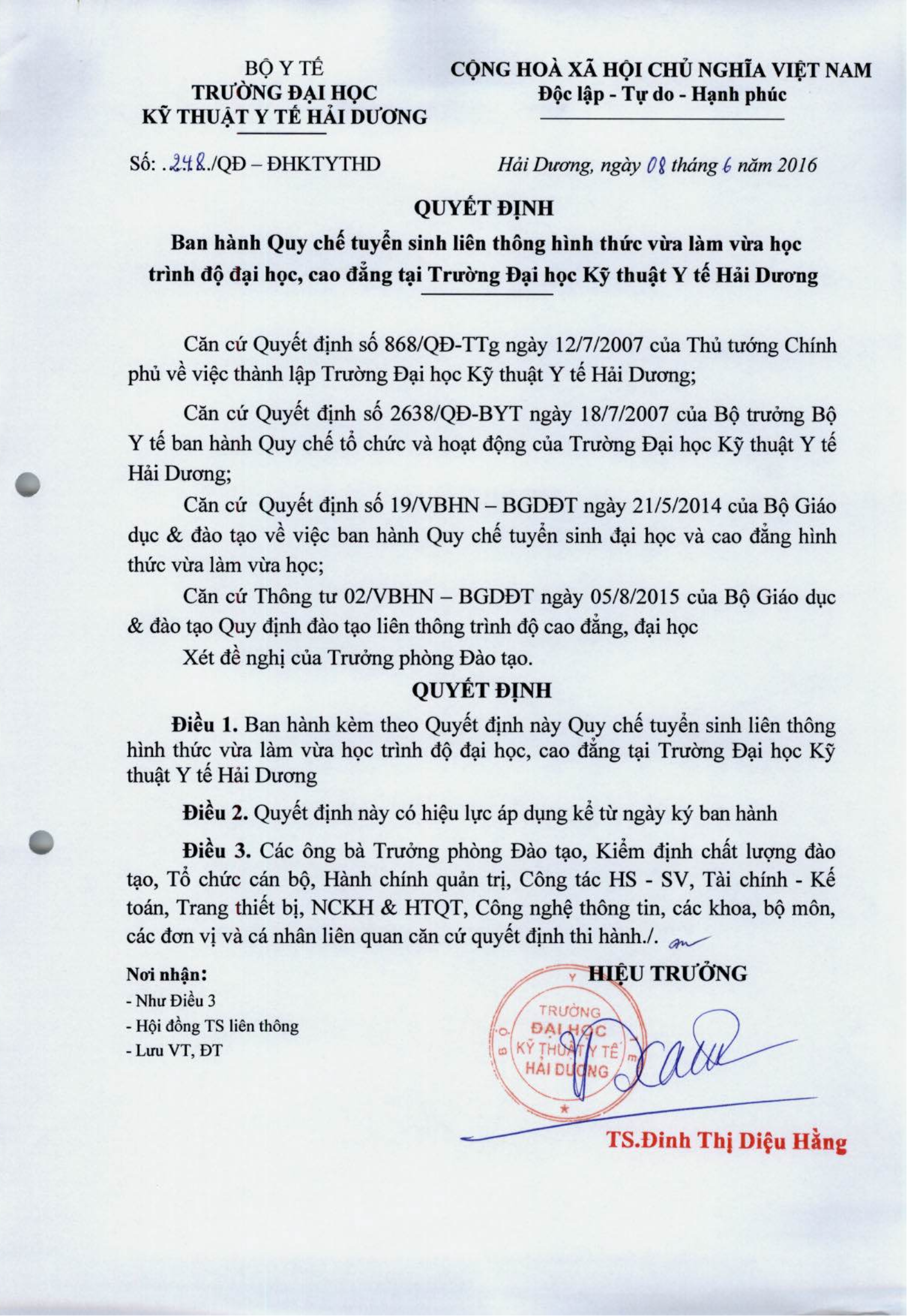Quy chế tuyển sinh liên thông vừa làm vừa học (Số: 248/QĐ -ĐHKTYTHD ngày 08/06/2016)