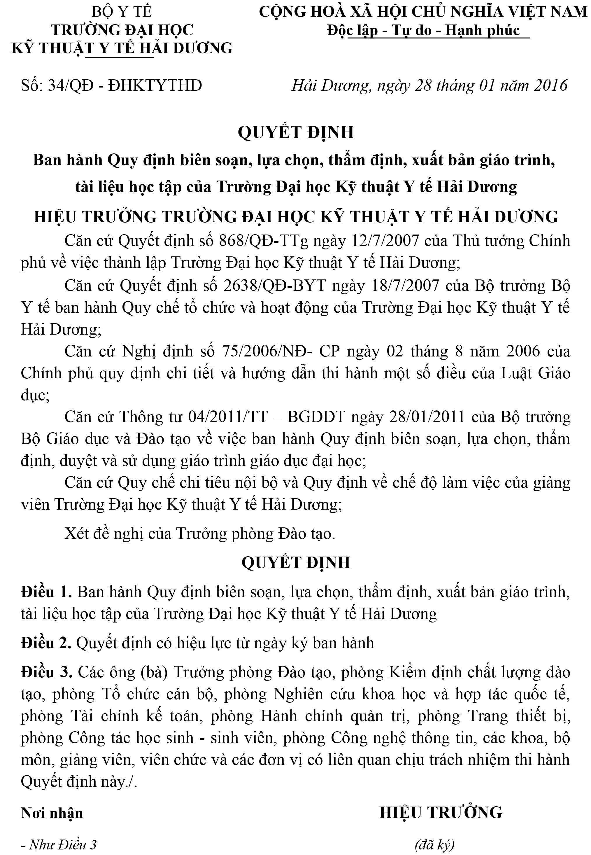 Quyết định và quy định về việc biên soạn giáo trình (Số: 34/QĐ-ĐHKTYTHD ngày 28/01/2016)