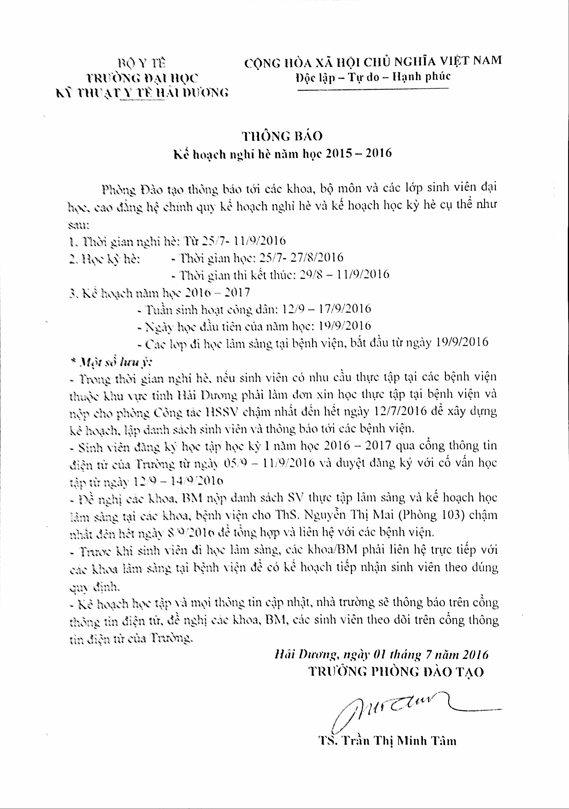 Kế hoạch nghỉ hề năm học 2015 - 2016