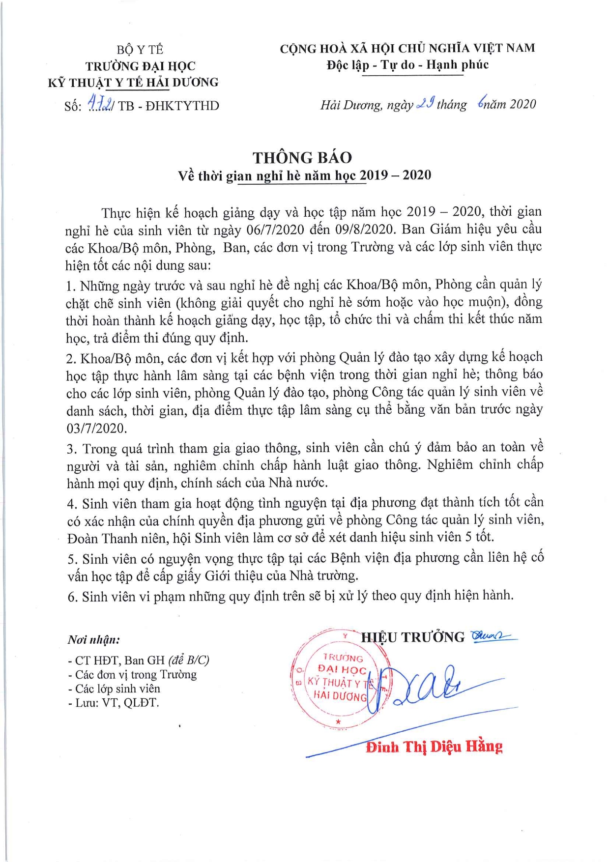 Thông báo về thời gian nghỉ hè năm học 2019 -2020