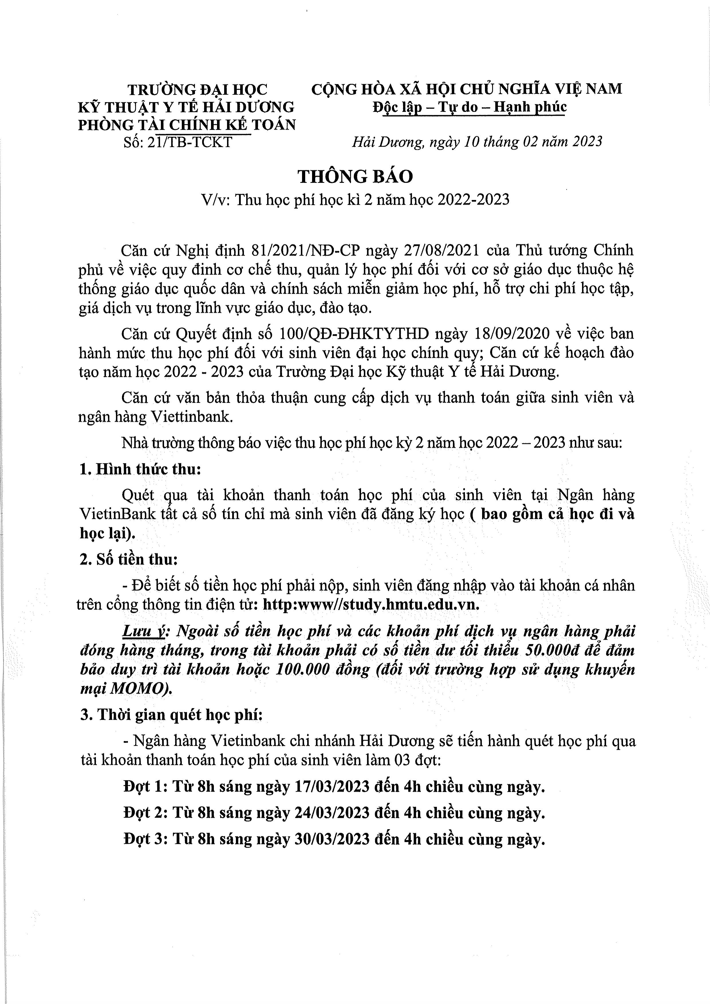 Thông báo v/v thu học phí kỳ 2 năm học 2022-2023