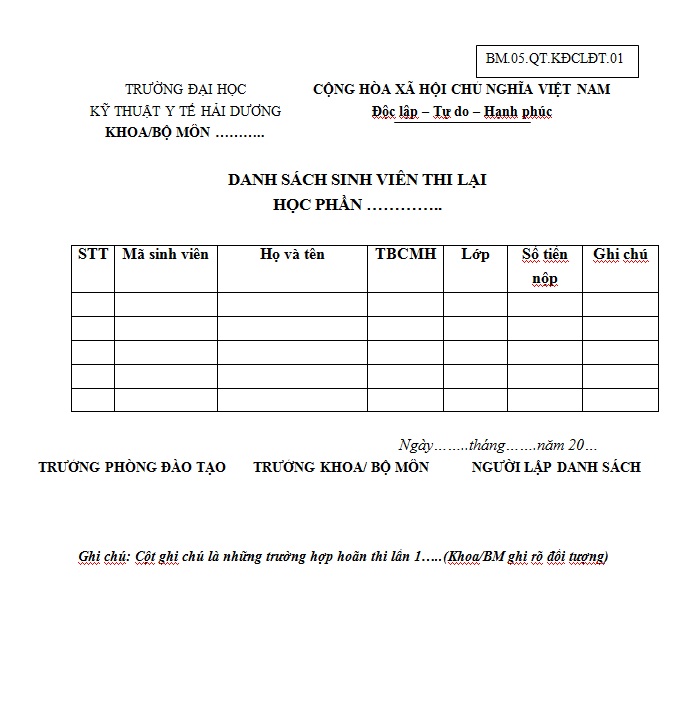 Biểu mẫu "Danh sách sinh viên thi lại"