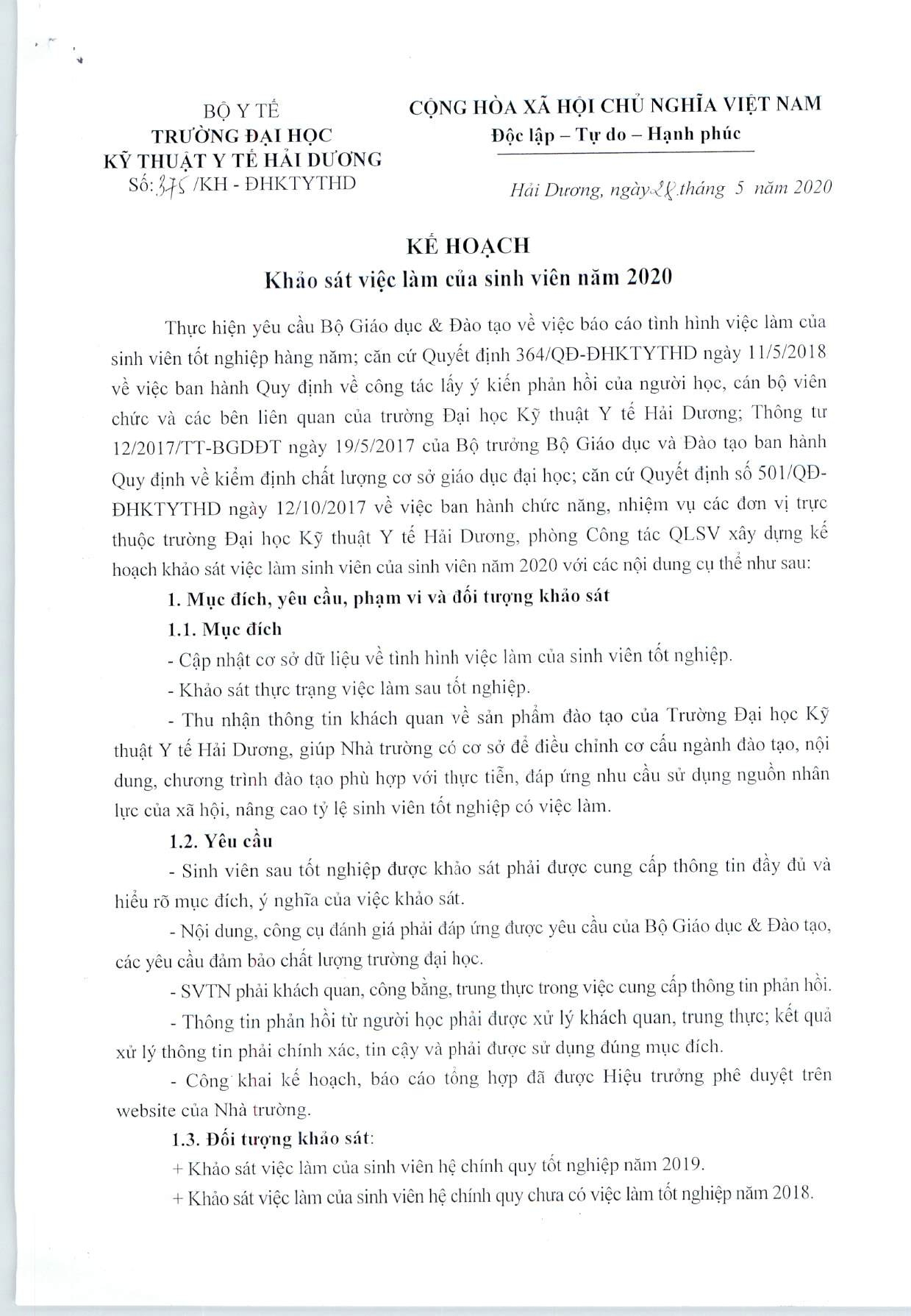 Kế hoạch khảo sát việc làm của sinh viên năm 2020