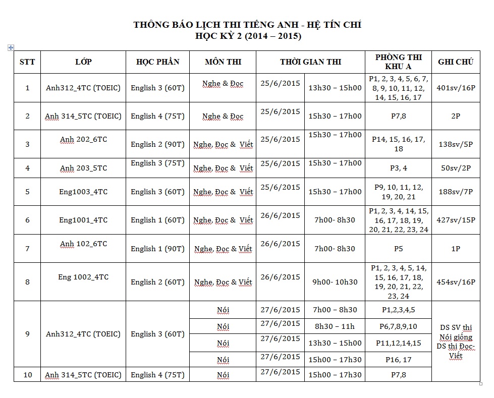 Lịch thi môn Tiếng Anh học kỳ II năm 2014 - 2015 Số lượt đọc: