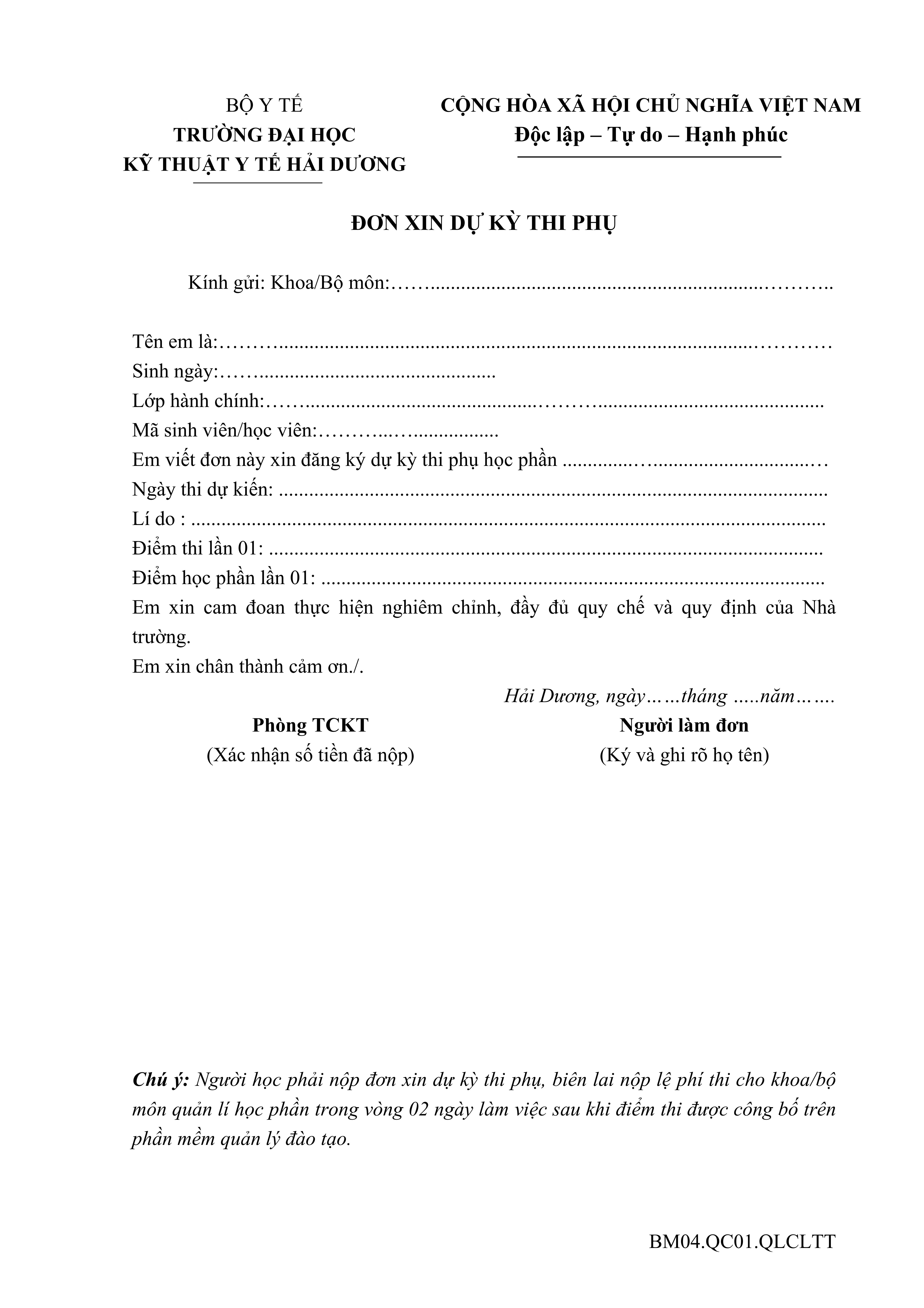 Biểu mẫu Đơn xin dự kỳ thi phụ (BM04.QC01.QLCLTT)