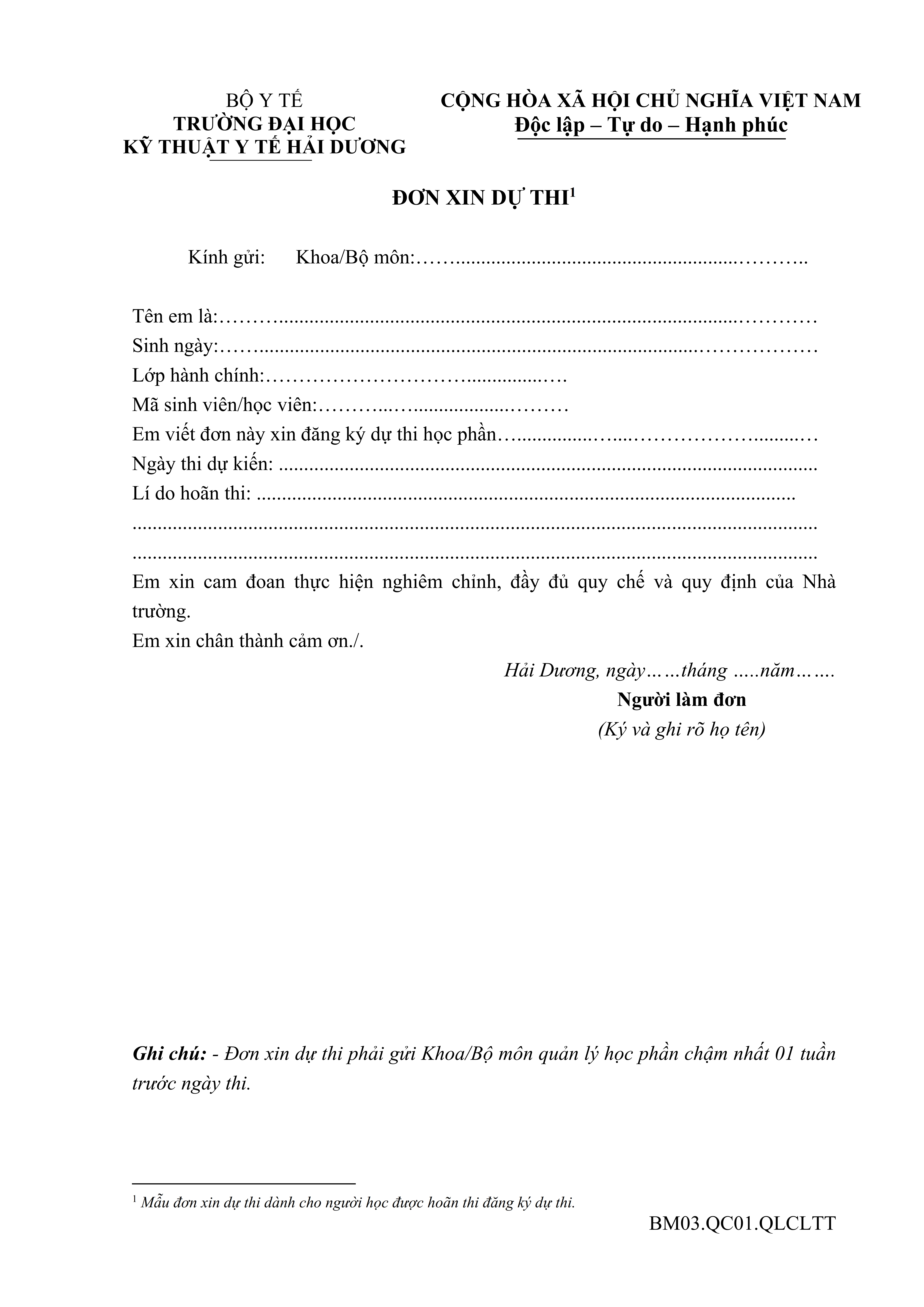 Biểu mẫu Đơn xin dự thi (người học hoãn thi) - BM03.QC01.QLCLTT