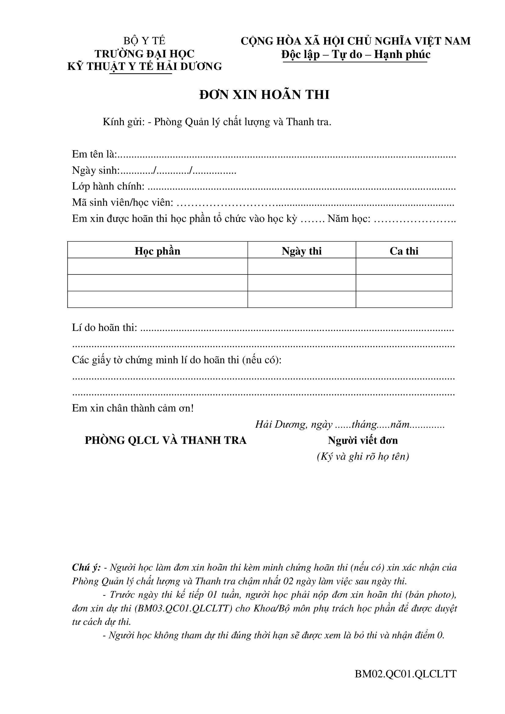 Biểu mẫu Đơn xin hoãn thi (BM02.QC01.QLCLTT)