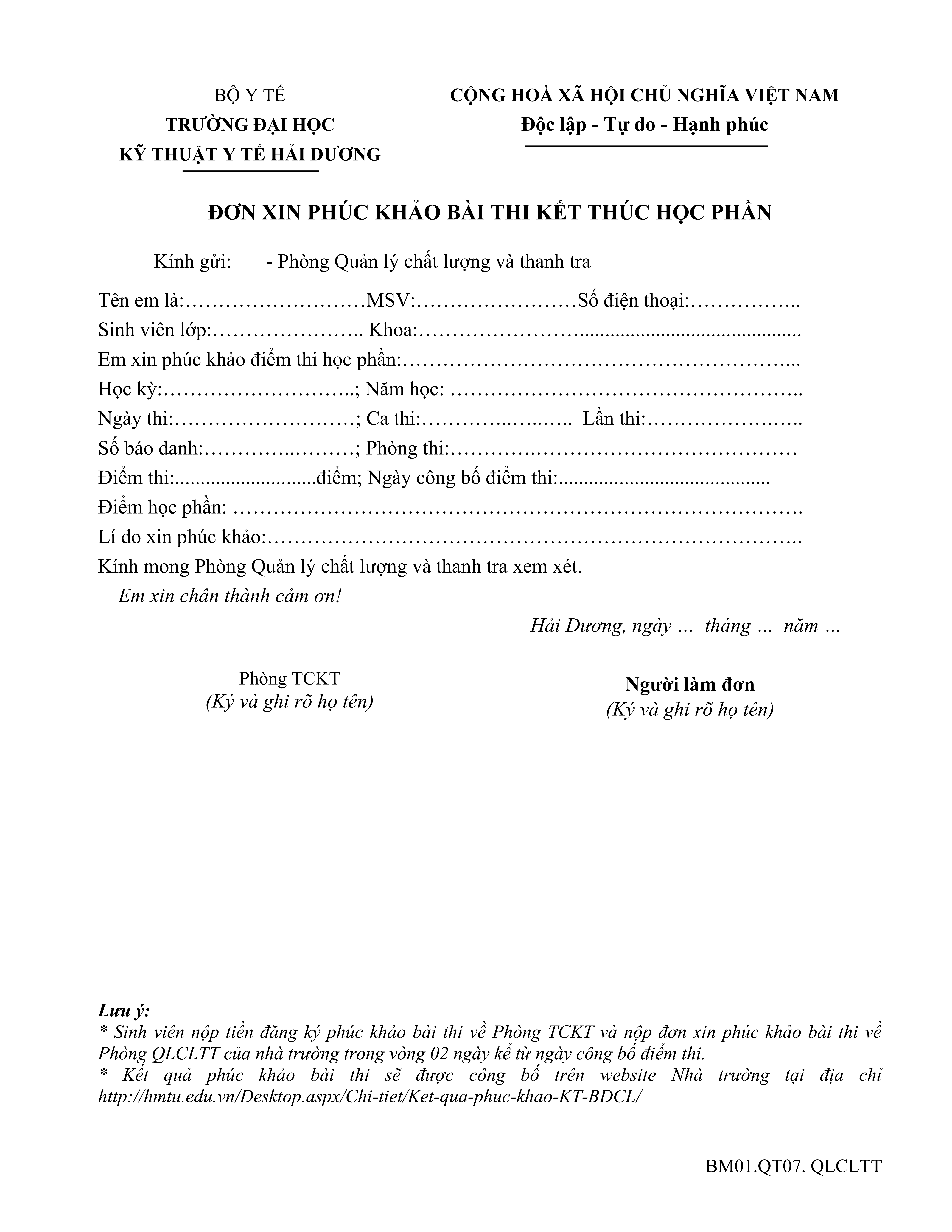 Biểu mẫu Đơn xin phúc khảo bài thi (BM01.QC07.QLCLTT)
