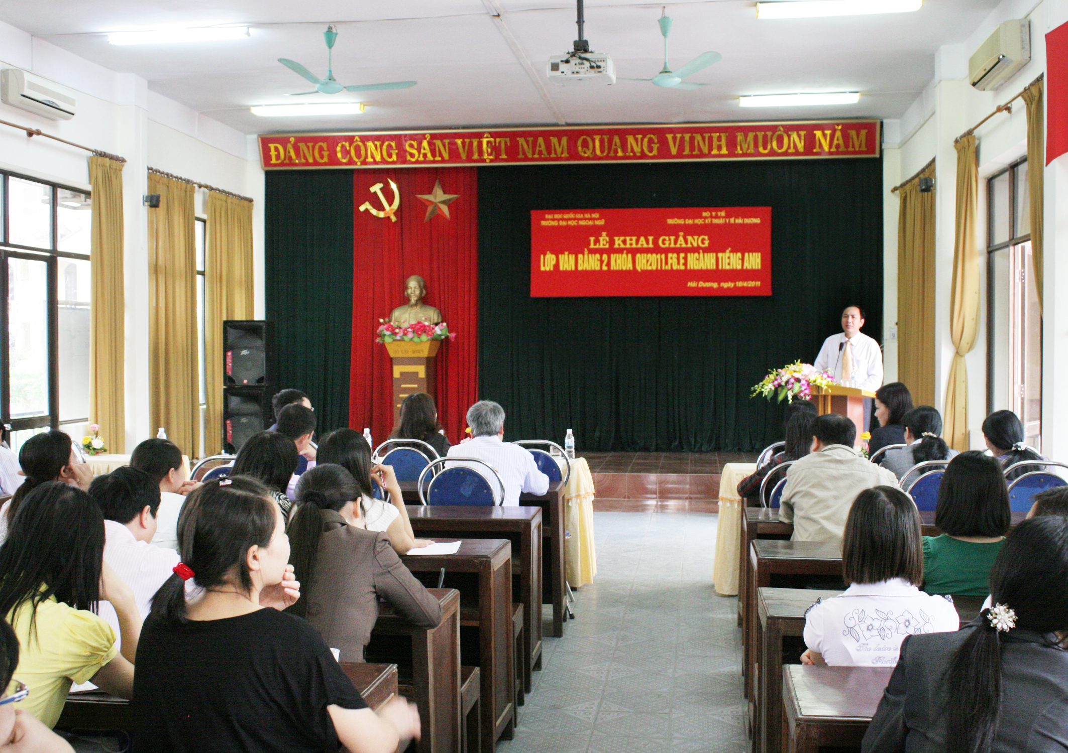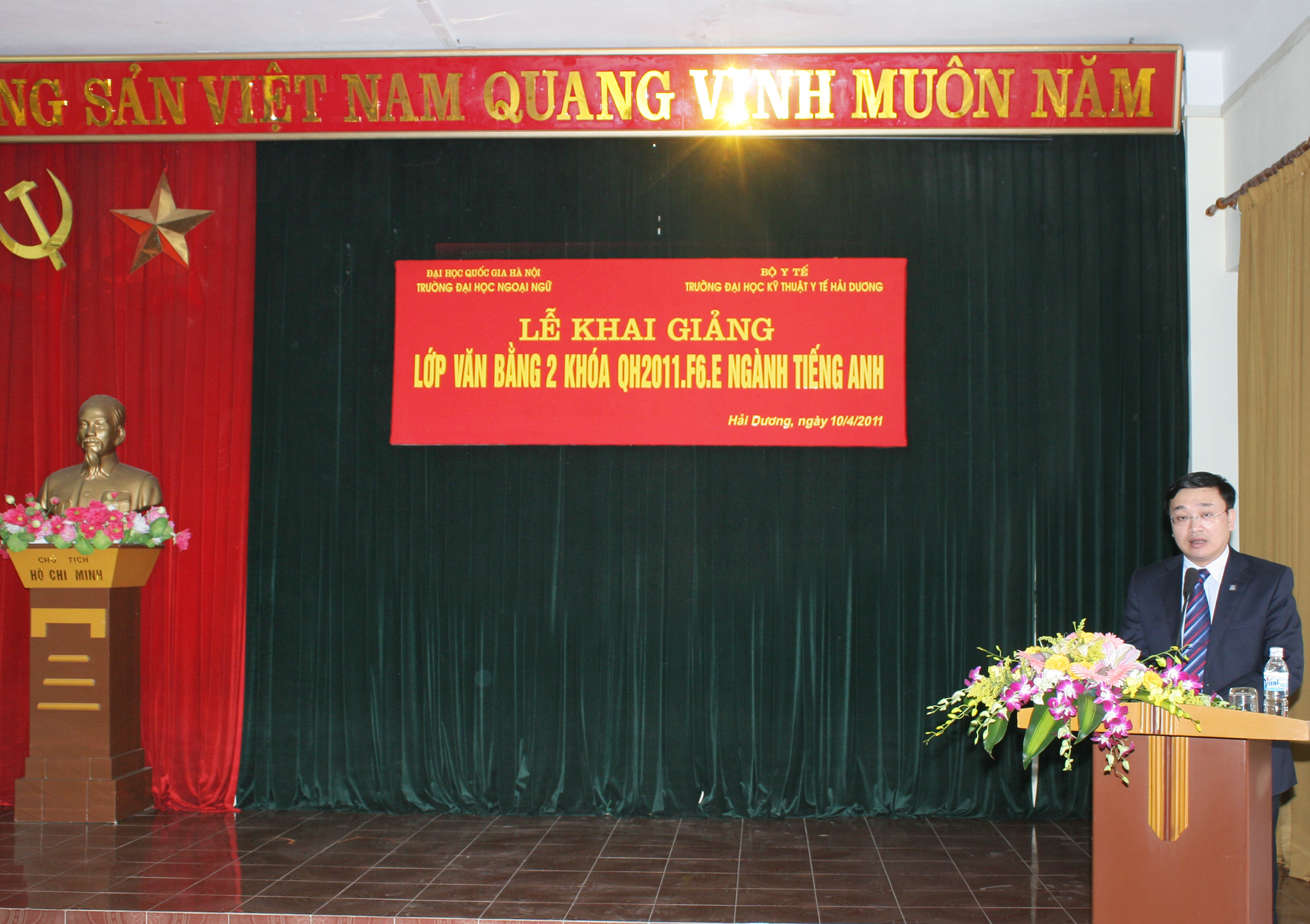 Ngày 10/4/2011 Trường Đại học Ngoại ngữ - Đại học Quốc gia Hà Nội đã tổ chức khai giảng lớp đại học văn bằng 2 hệ vừa làm vừa học ngành tiếng Anh cho 79 học viên là các cán bộ, giảng viên của Trường Đại học Kỹ thuật Y tế Hải Dương. Tại Lễ Khai giảng Tiến sỹ Đỗ Tuấn Minh Phó Hiệu trưởng Trường Đại học Ngoại ngữ - Đại học Quốc gia Hà Nội đã nhấn mạnh tầm quan trọng của việc học tập ngoại ngữ, những khó khăn thử thách phải vượt qua trong quá trình thực hiện chương trình đào tạo đồng thời yêu cầu học viên phải tranh thủ cơ hội tích luỹ kiến thức và rèn luyện kỹ năng thực hành tiếng Anh góp phần phục vụ tốt cho giảng dạy, học tập và nghiên cứu khoa học thực hiện thành công quá trình hội nhập quốc tế.