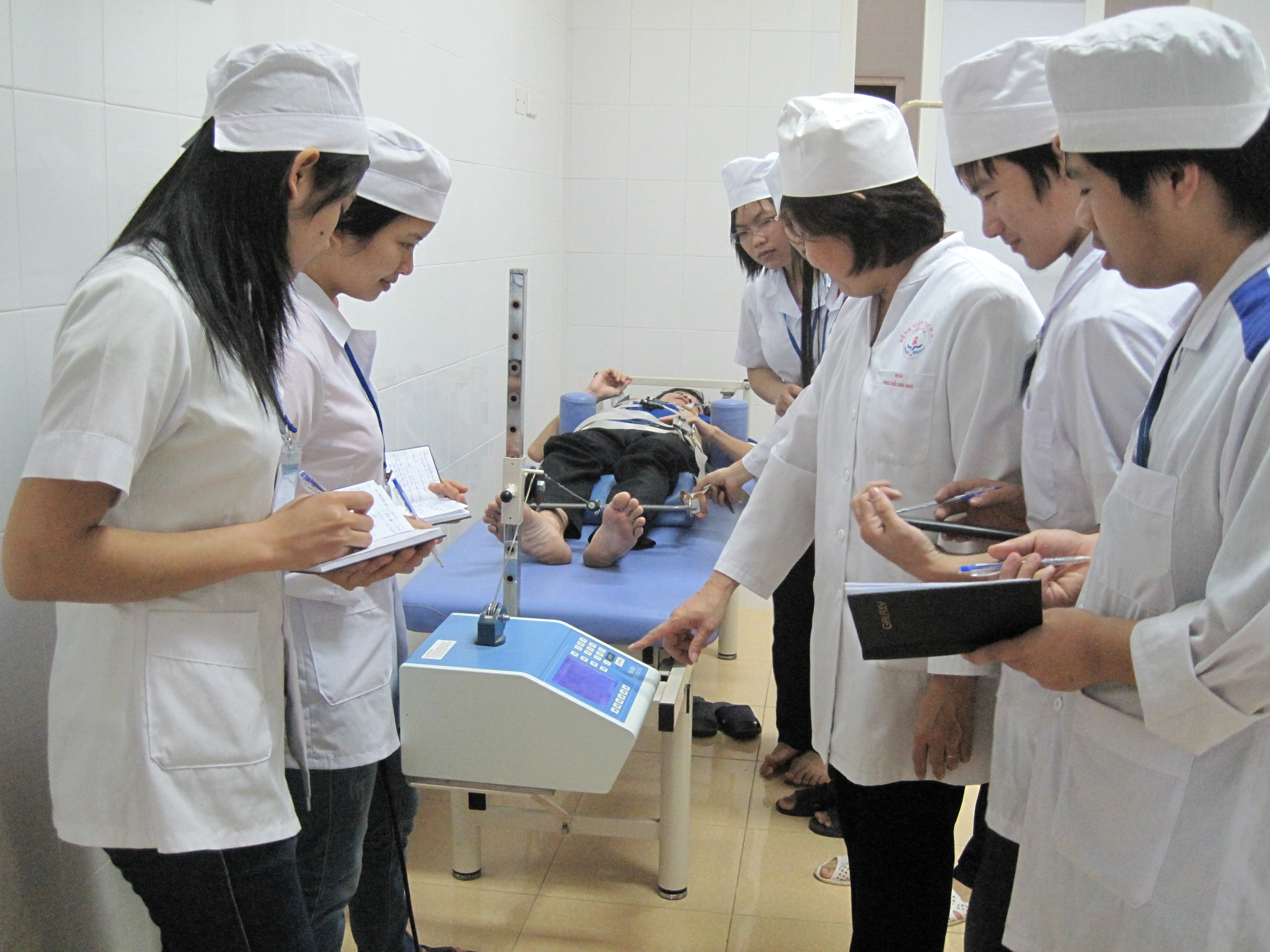 Phục hồi chức năng Kỹ thuật viên Vật lý trị liệu tuỳ trình độ đào tạo có khả năng lập và thực hiện kế hoạch can thiệp vật lý trị liệu có hệ thống, an toàn cho người bệnh; quản lý, phòng ngừa tàn tật, phục hồi chức năng và giáo dục sức khoẻ cho người bệnh, người tàn tật và cộng đồng; có đạo đức nghề nghiệp, khả năng làm việc độc lập, làm việc theo nhóm và học tập suốt đời. - Bậc đào tạo: Đại học, Cao đẳng, Trung cấp - Hình thức đào tạo: Dài hạn: Chính quy, Vừa làm vừa học Đào tạo cấp chứng chỉ: bổ túc VLTL (3 tháng, 6 tháng), nhân viên xoa bóp - Nơi làm việc sau khi tốt nghiệp: Bệnh viện, Viện nghiên cứu, các Trường Đại học, Cao đẳng, Trung cấp y tế, Viện Điều dưỡng - PHCN, Trung tâm PHCN và các cơ sở y tế khác.  Thực hành Vật lý trị liệu Physiotherapy practice