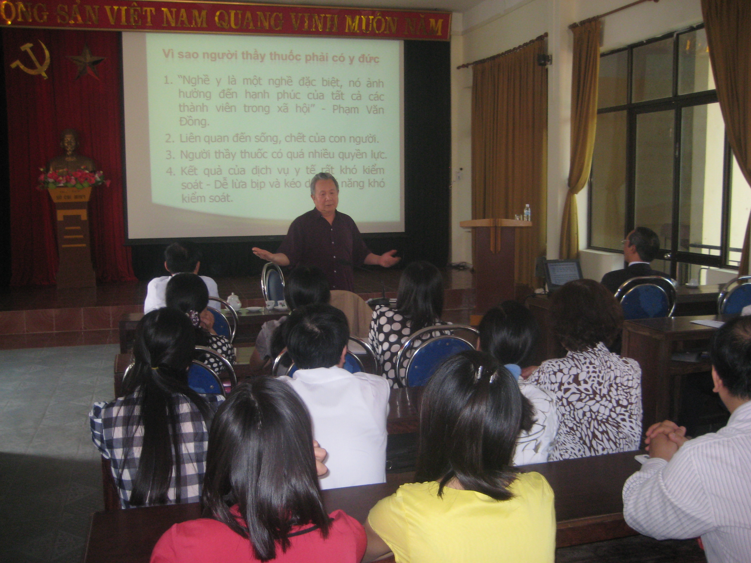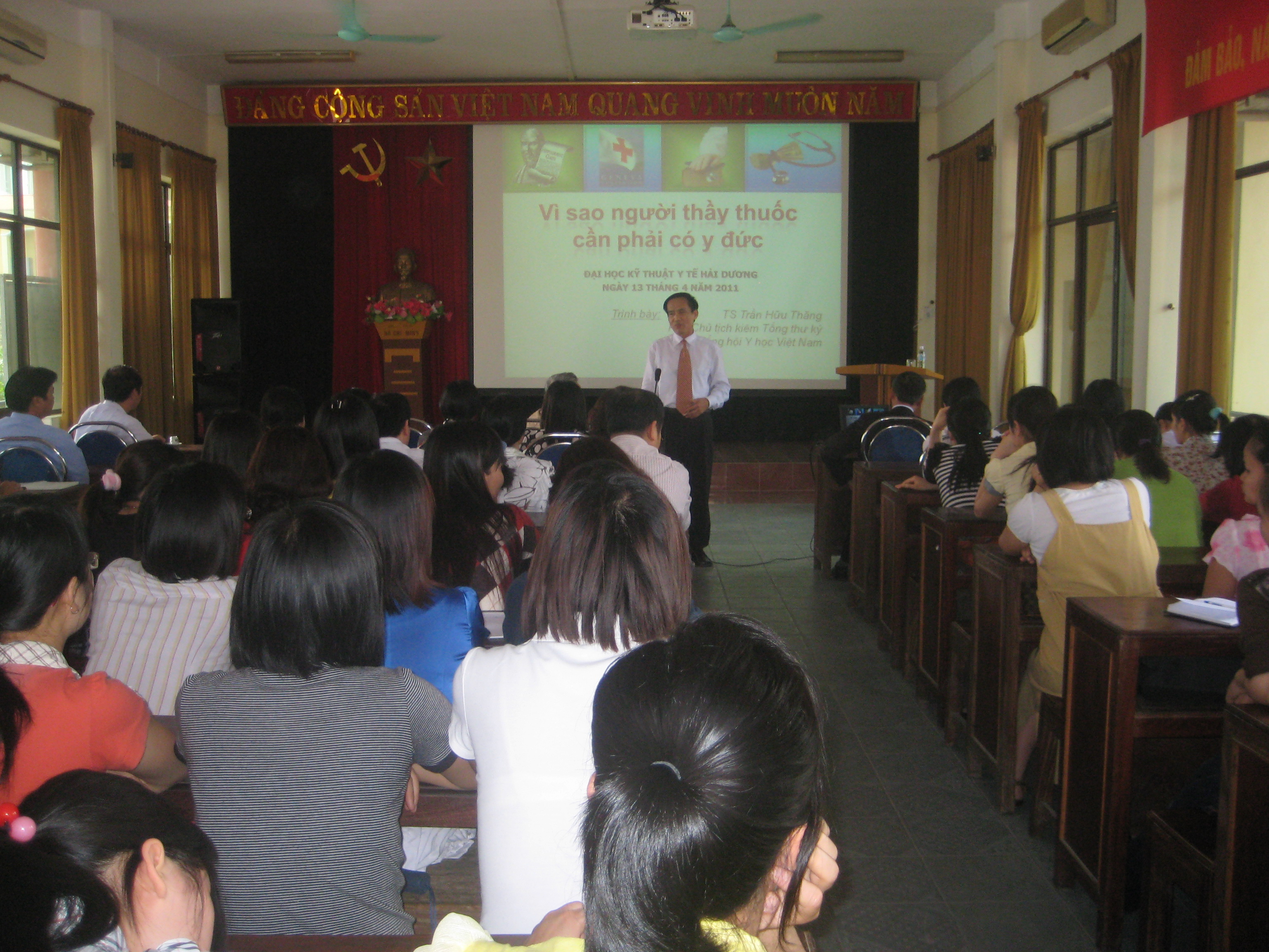 Tin nhà trường | Sinh hoạt Khoa học chuyên đề Y đức Thực hiện mục tiêu đào tạo nguồn nhân lực Điều dưỡng - Kỹ thuật viên chất lượng cao, có năng lực chuyên môn và đạo đức nghề nghiệp tốt. Ngày 13/4/2011, tại Trường Đại học Kỹ thuật Y tế Hải Dương đã tổ chức buổi sinh hoạt chuyên đề về Y đức do TS Trần Hữu Thăng - Phó Chủ tịch kiêm Tổng thư ký Tổng hội Y học Việt Nam trình bày. Với phương pháp trình bày ngắn gọn, dễ hiểu và sinh động, chia sẻ kinh nghiệm của bản thân gắn với thực tiễn công việc thường nhật của các cán bộ y tế trong quá trình thực hiện nhiệm vụ, báo cáo viên đã lý giải tại sao người thầy thuốc cần phải có y đức, những nguyên tắc cơ bản, cốt lõi của việc hình thành và rèn luyện y đức đối với mỗi cán bộ, nhân viên y tế và HSSV ngành Y. Buổi sinh hoạt khoa học đã mang lại cho mỗi cán bộ, giảng viên và học sinh, sinh viên những bài học và suy ngẫm đối với bản thân trong quá trình tu dưỡng và rèn luyện y đức của người cán bộ y tế trong sự nghiệp chăm sóc và bảo vệ sức khoẻ nhân dân.