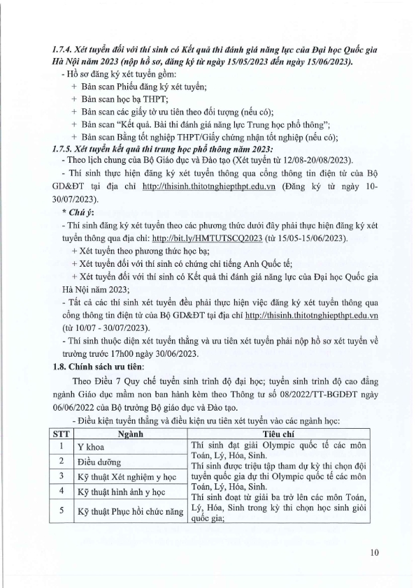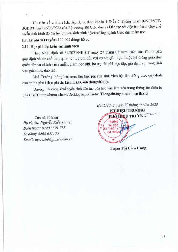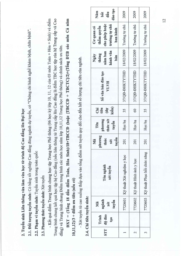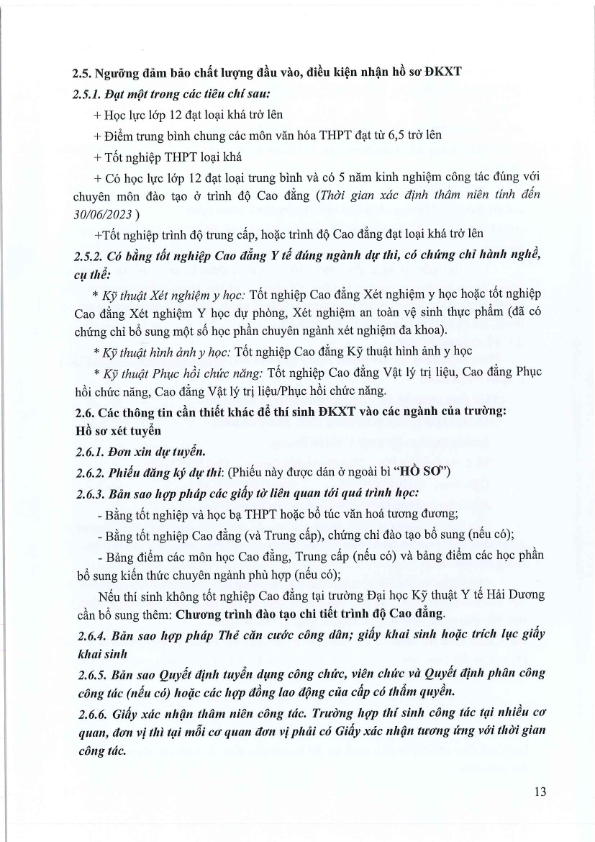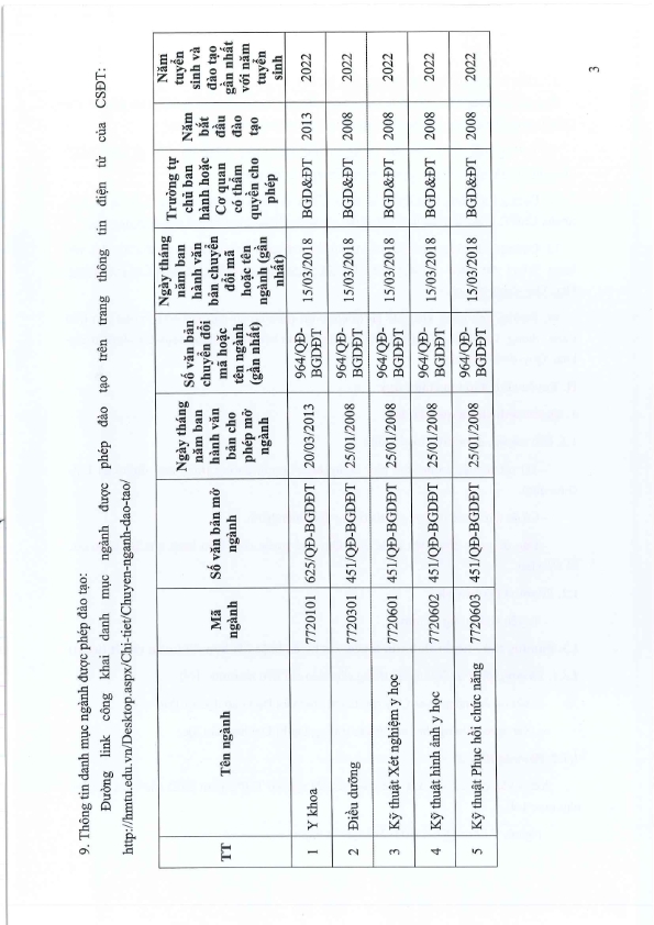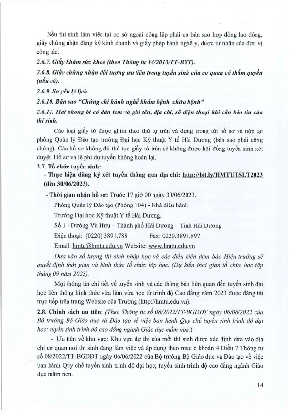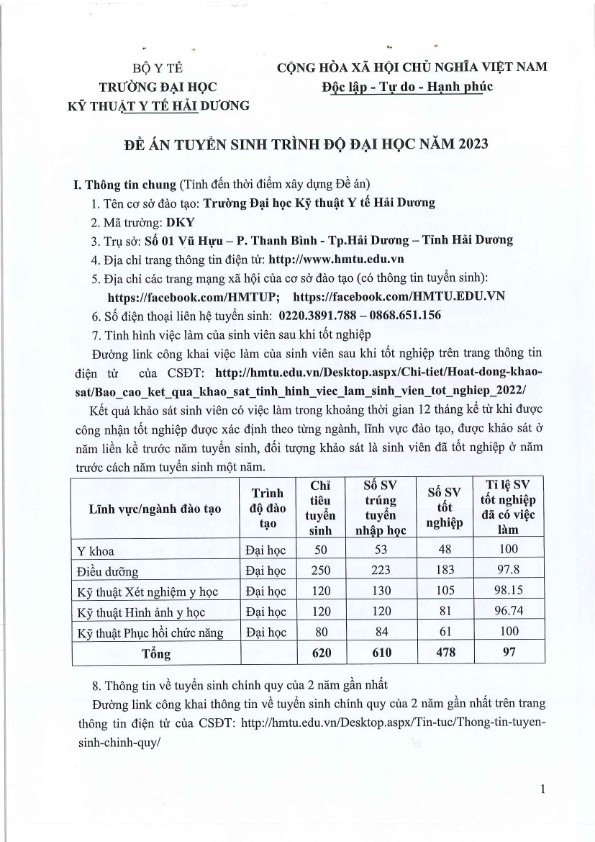 04/06/2024 04:24:47 PM | Tin mới: THÔNG TIN TUYỂN SINH TRÌNH ĐỘ ĐẠI HỌC NĂM 2025 10/04/2025 03:40' PM I. THÔNG TIN CHUNG: 1. Tên cơ sở đào tạo: Trường Đại học Kỹ thuật Y tế Hải Dương 2. Mã trường: DKY 3. Trụ sở: Số 01 Vũ Hựu – P. Thanh Bình - Tp.Hải Dương – Tỉnh Hải Dương 4. Địa chỉ trang thông tin điện tử: http://www.hmtu.edu.vn 5. Số điện thoại liên hệ tuyển sinh: 0220.3891.788 – 056.3291.788 6. Địa chỉ công khai quy chế tuyển sinh; Thông tin tuyển sinh 6.1. Đường link công khai Thông tin tuyển sinh trên trang thông tin điện tử của Trường: http://hmtu.edu.vn/Desktop.aspx/Tin-tuc/De-an-tuyen-sinh/ 6.2. Đường link công khai Quy chế tuyển sinh của cơ sở đào tạo trên trang thông tin điện tử của Trường: http://hmtu.edu.vn/Desktop.aspx/Cac-hoat-dong-khac/Quy-dinh-quy-che/ 6.3. Đường link công khai Quy chế thi tuyển sinh trên trang thông tin điện tử của Trường: http://hmtu.edu.vn/Desktop.aspx/Cac-hoat-dong-khac/Quy-dinh-quy-che/ 6.4. Đường link công khai Đề án tổ chức thi trên trang thông tin điện tử của Trường: http://hmtu.edu.vn/Desktop.aspx/Cac-hoat-dong-khac/Quy-dinh-quy-che/ 7. Địa chỉ công khai các thông tin về hoạt động của Trường: 7.1. Đường link công khai việc làm của sinh viên sau khi tốt nghiệp trên trang thông tin điện tử của Trường: http://hmtu.edu.vn/Desktop.aspx/Chi-tiet/Hoat-dong-khao-sat/Bao_cao_ket_qua_khao_sat_tinh_hinh_viec_lam_sinh_vien_tot_nghiep_2024/ 7.2. Đường link công khai thông tin về tuyển sinh chính quy của 2 năm gần nhất trên trang thông tin điện tử của Trường: http://hmtu.edu.vn/Desktop.aspx/Tin-tuc/Thong-tin-tuyen-sinh-chinh-quy/ 7.3. Đường link công khai danh mục ngành được phép đào tạo trên trang thông tin điện tử của Trường: http://hmtu.edu.vn/Desktop.aspx/Chi-tiet/Chuyen-nganh-dao-tao/ 7.4. Đường link công khai các điều kiện đảm bảo chất lượng trên trang thông tin điện tử của Trường: http://hmtu.edu.vn/Desktop.aspx/Gioi-thieu/Noi-dung-cong-khai/