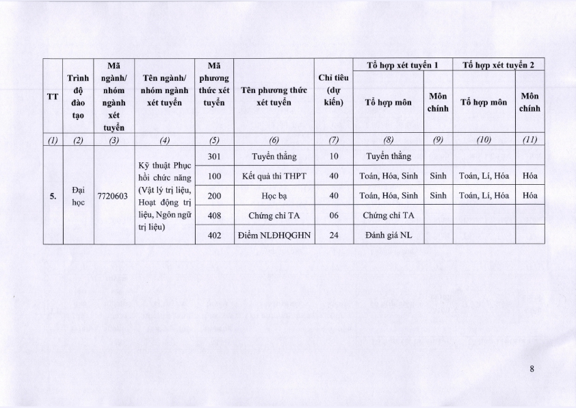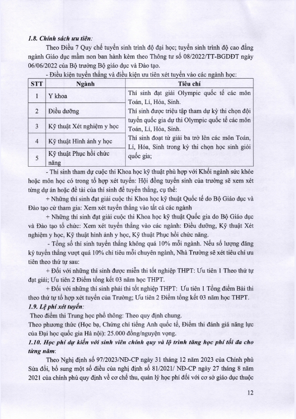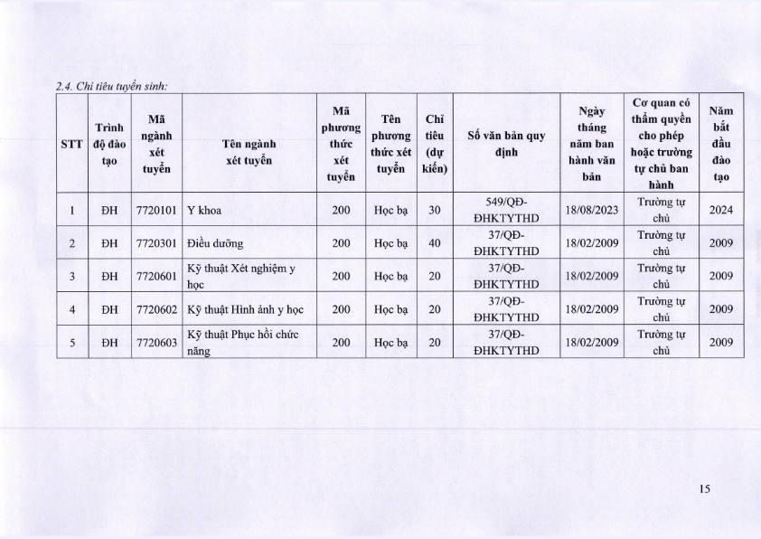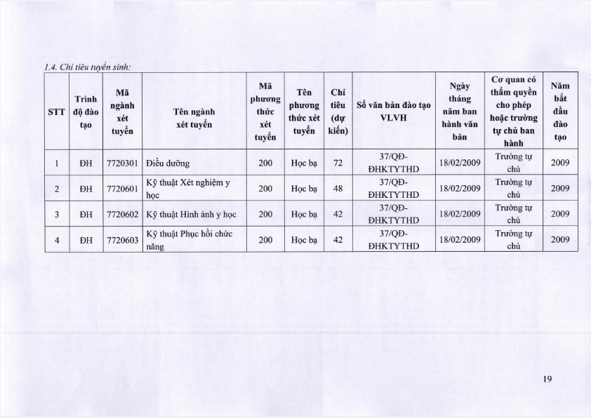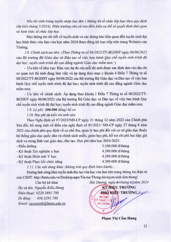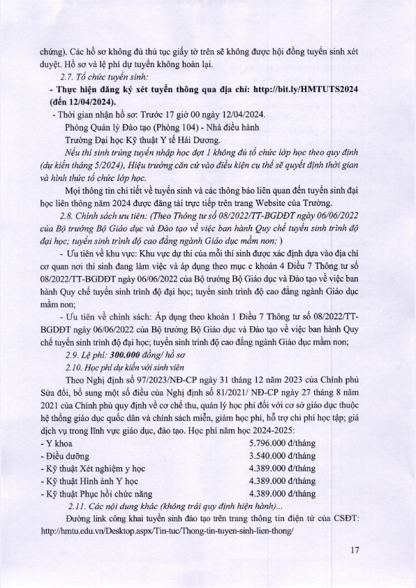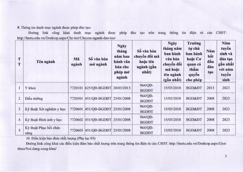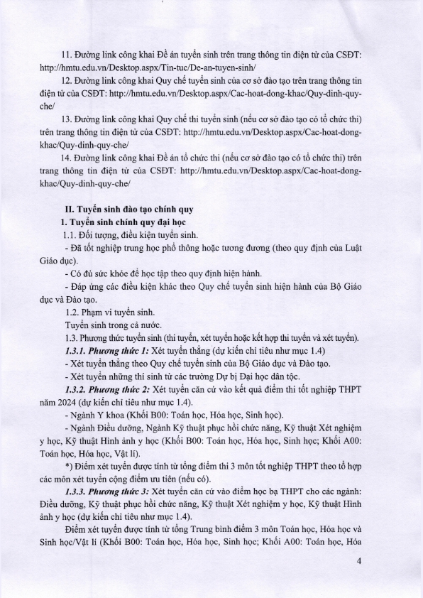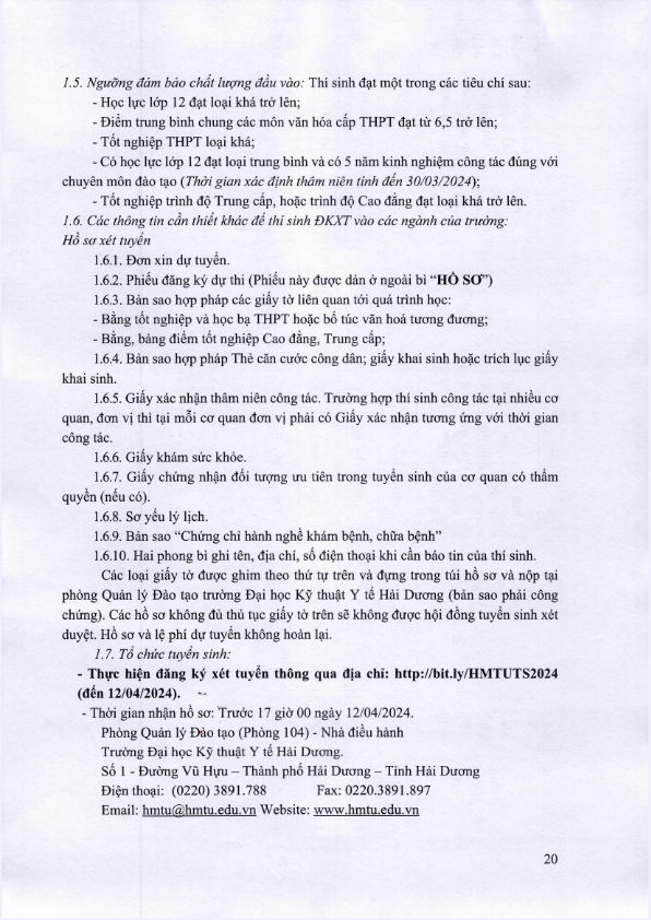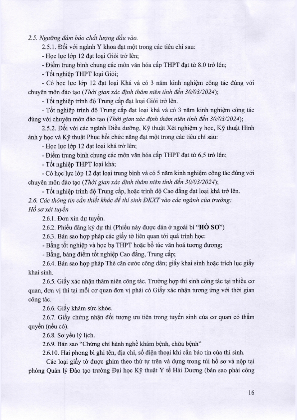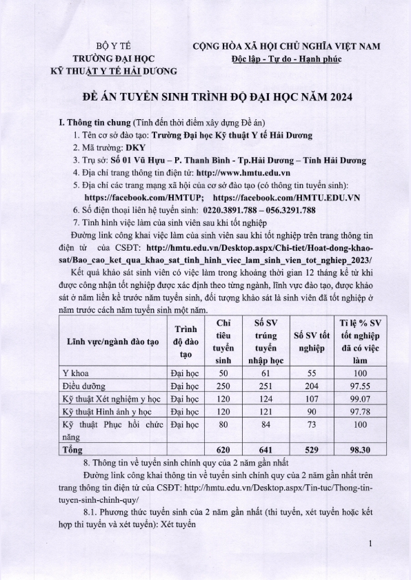 04/06/2024 04:33:22 PM | Tin mới: THÔNG TIN TUYỂN SINH TRÌNH ĐỘ ĐẠI HỌC NĂM 2025 10/04/2025 03:40' PM I. THÔNG TIN CHUNG: 1. Tên cơ sở đào tạo: Trường Đại học Kỹ thuật Y tế Hải Dương 2. Mã trường: DKY 3. Trụ sở: Số 01 Vũ Hựu – P. Thanh Bình - Tp.Hải Dương – Tỉnh Hải Dương 4. Địa chỉ trang thông tin điện tử: http://www.hmtu.edu.vn 5. Số điện thoại liên hệ tuyển sinh: 0220.3891.788 – 056.3291.788 6. Địa chỉ công khai quy chế tuyển sinh; Thông tin tuyển sinh 6.1. Đường link công khai Thông tin tuyển sinh trên trang thông tin điện tử của Trường: http://hmtu.edu.vn/Desktop.aspx/Tin-tuc/De-an-tuyen-sinh/ 6.2. Đường link công khai Quy chế tuyển sinh của cơ sở đào tạo trên trang thông tin điện tử của Trường: http://hmtu.edu.vn/Desktop.aspx/Cac-hoat-dong-khac/Quy-dinh-quy-che/ 6.3. Đường link công khai Quy chế thi tuyển sinh trên trang thông tin điện tử của Trường: http://hmtu.edu.vn/Desktop.aspx/Cac-hoat-dong-khac/Quy-dinh-quy-che/ 6.4. Đường link công khai Đề án tổ chức thi trên trang thông tin điện tử của Trường: http://hmtu.edu.vn/Desktop.aspx/Cac-hoat-dong-khac/Quy-dinh-quy-che/ 7. Địa chỉ công khai các thông tin về hoạt động của Trường: 7.1. Đường link công khai việc làm của sinh viên sau khi tốt nghiệp trên trang thông tin điện tử của Trường: http://hmtu.edu.vn/Desktop.aspx/Chi-tiet/Hoat-dong-khao-sat/Bao_cao_ket_qua_khao_sat_tinh_hinh_viec_lam_sinh_vien_tot_nghiep_2024/ 7.2. Đường link công khai thông tin về tuyển sinh chính quy của 2 năm gần nhất trên trang thông tin điện tử của Trường: http://hmtu.edu.vn/Desktop.aspx/Tin-tuc/Thong-tin-tuyen-sinh-chinh-quy/ 7.3. Đường link công khai danh mục ngành được phép đào tạo trên trang thông tin điện tử của Trường: http://hmtu.edu.vn/Desktop.aspx/Chi-tiet/Chuyen-nganh-dao-tao/ 7.4. Đường link công khai các điều kiện đảm bảo chất lượng trên trang thông tin điện tử của Trường: http://hmtu.edu.vn/Desktop.aspx/Gioi-thieu/Noi-dung-cong-khai/