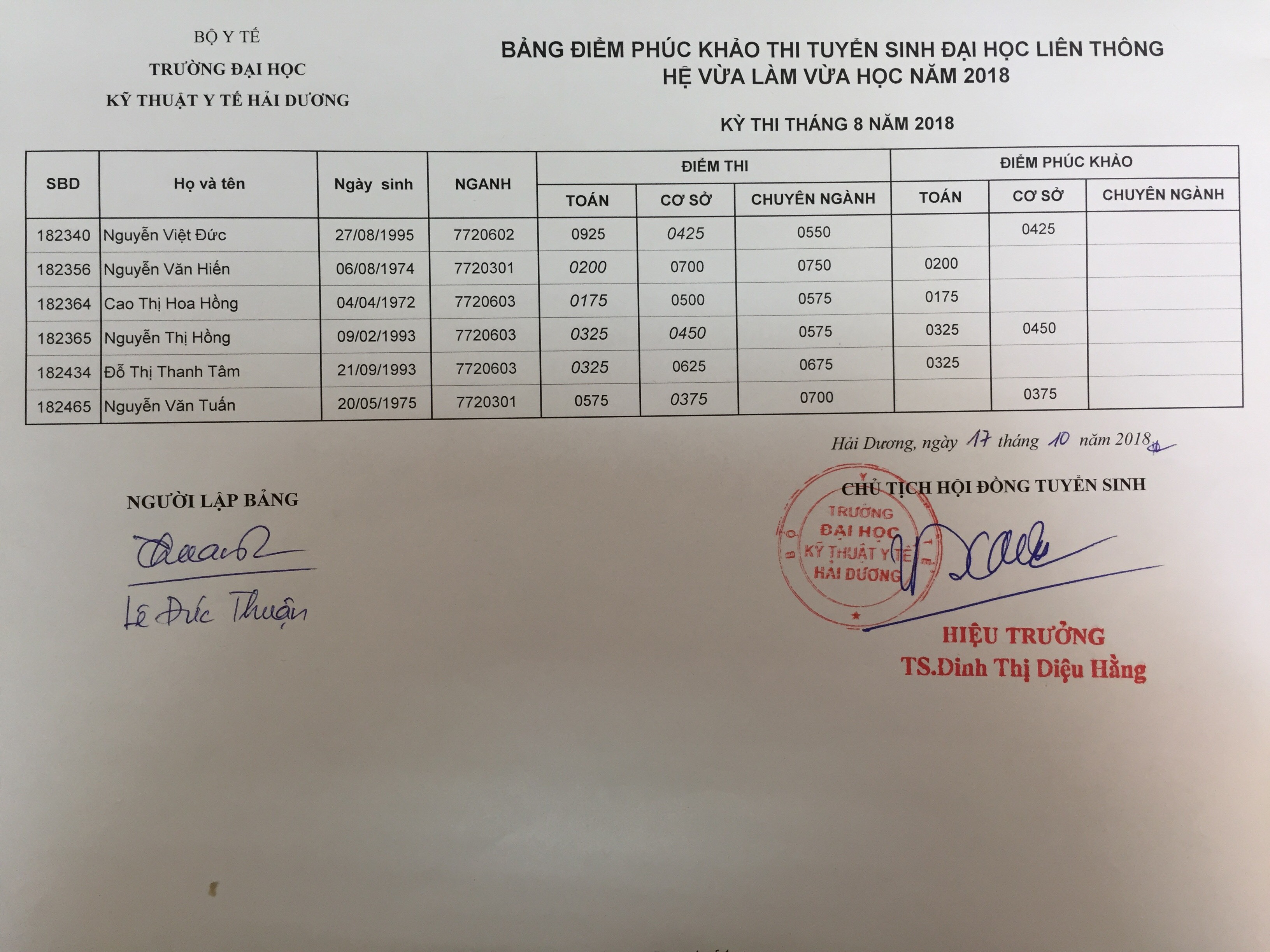 Kết quả phúc khảo | Kết quả chấm phúc khảo bài thi tuyển sinh năm 2018