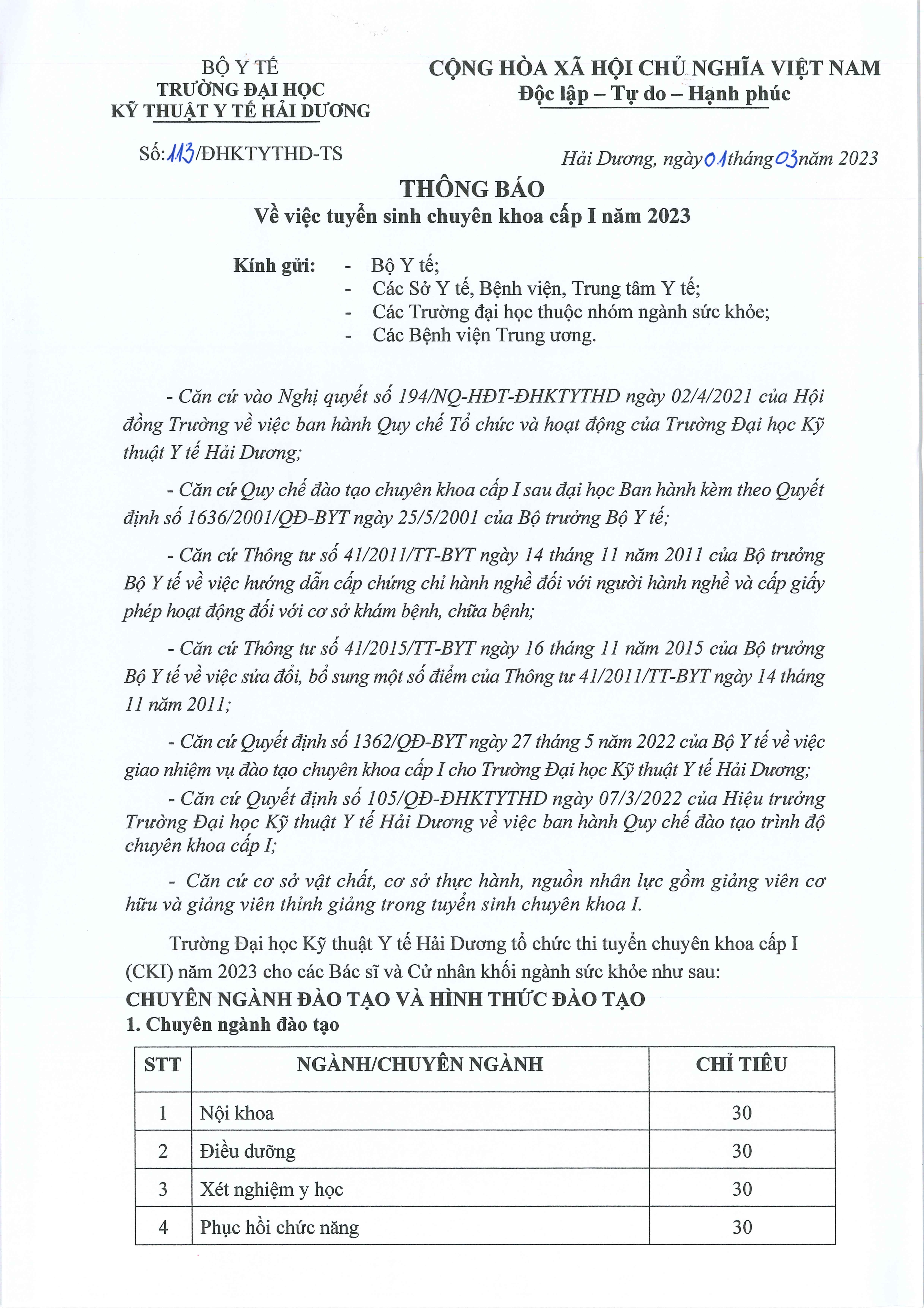Thông báo tuyển sinh | Thông báo tuyển sinh chuyên khoa I năm 2023