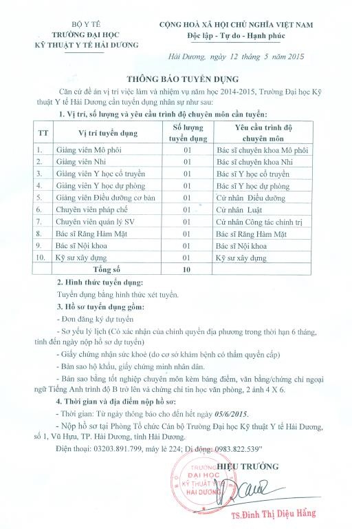 15/05/2015 10:53:00 AM | Tin mới: Thông báo của Trường Đại học Kỹ thuật Y tế Hải Dương về việc khảo sát, lập phương án, dự toán (báo giá) dịch vụ bảo vệ chuyên nghiệp (Số 1416/TB-ĐHKTYTHD ngày 13/11/2025) 14/11/2025 10:38' AM