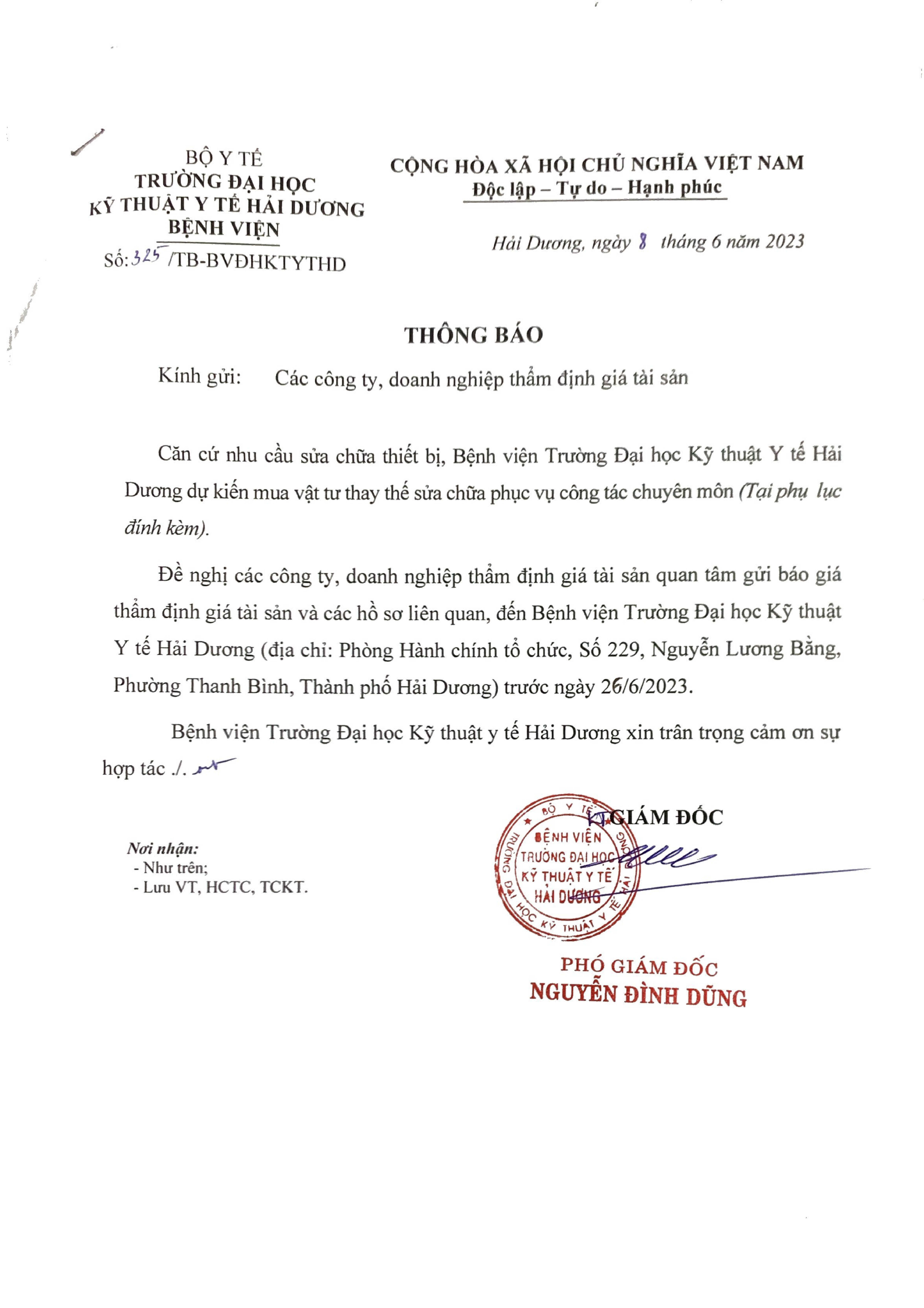 Yêu cầu báo giá của Bệnh viện Trường Đại học Kỹ thuật Y tế Hải Dương (Số 1281/TB-BVĐHKTYTHD ngày 20/10/2025) 20/10/2025 04:32' PM