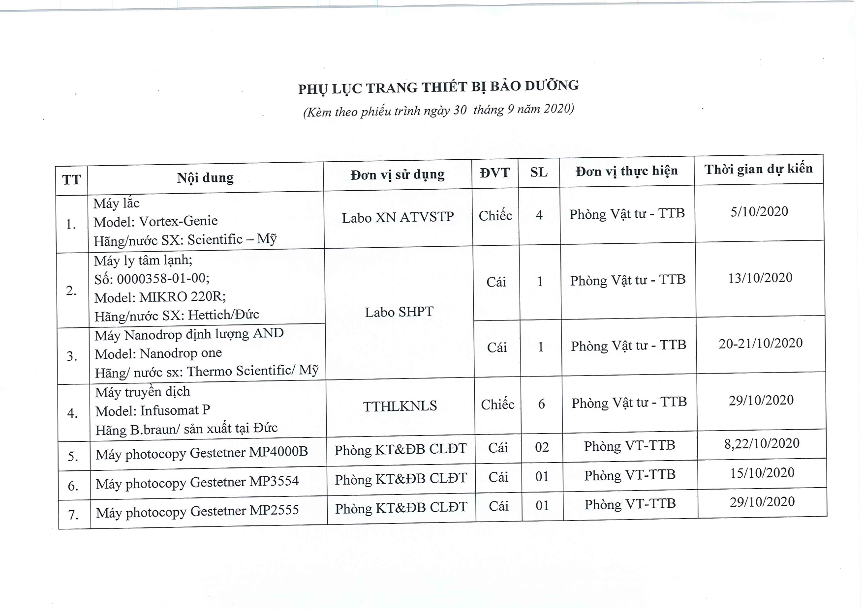 Kế hoạch bảo dưỡng trang thiết bị tháng 9/2020 03/09/2020 10:52' AM