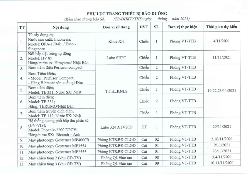 Thông báo | Kế hoạch bảo dưỡng trang thiết bị tháng 11/2021