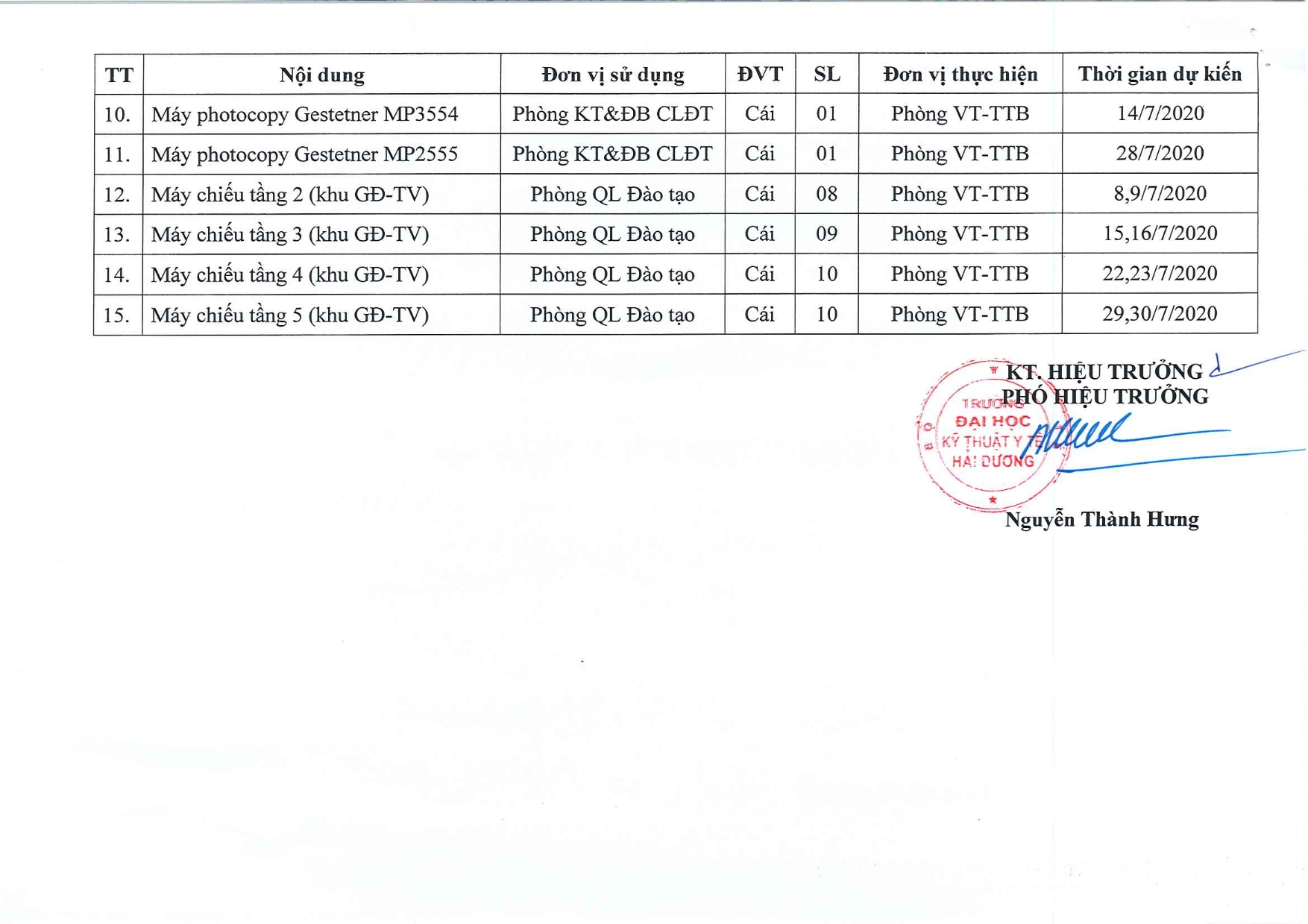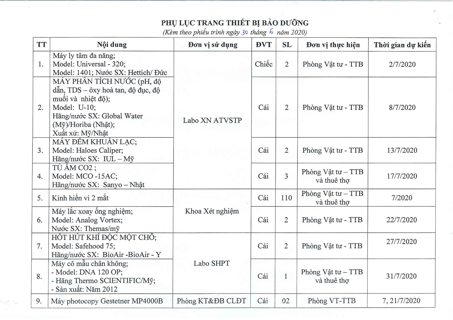 Lịch bảo dưỡng Trang thiết bị Tháng 6/2020 01/06/2020 03:31' PM