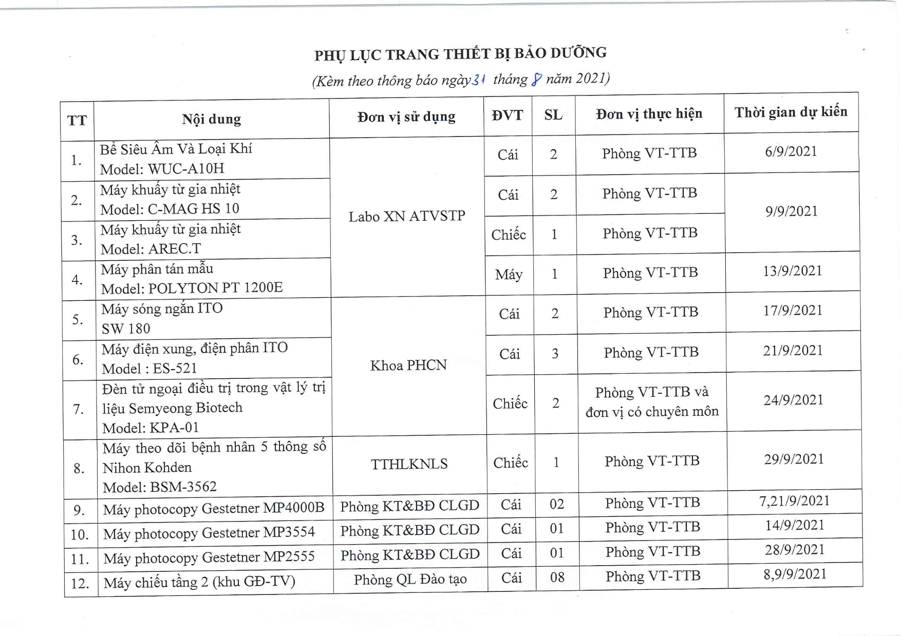 Kế hoạch bảo dưỡng trang thiết bị tháng 8/2021 03/08/2021 10:03' AM