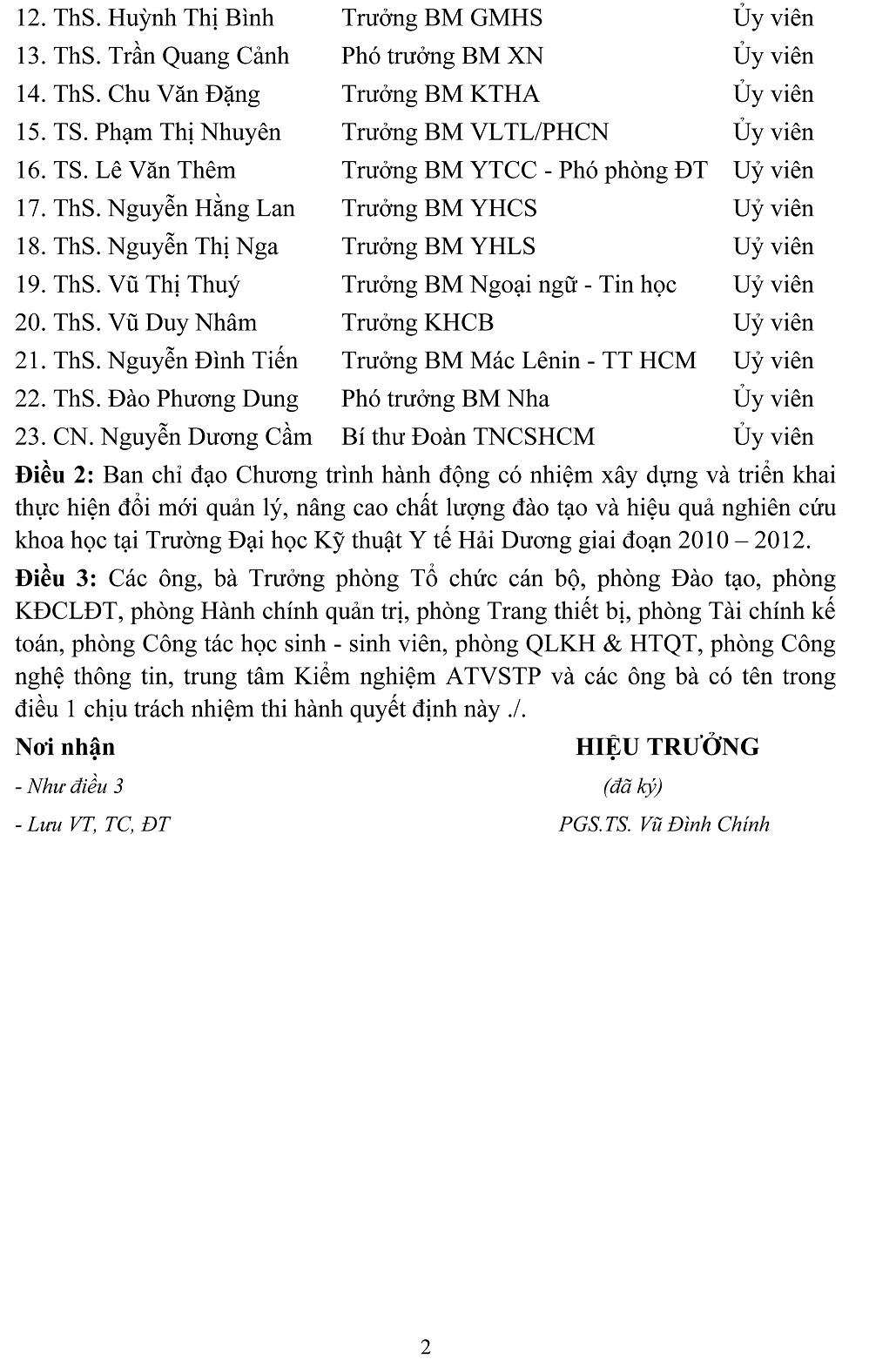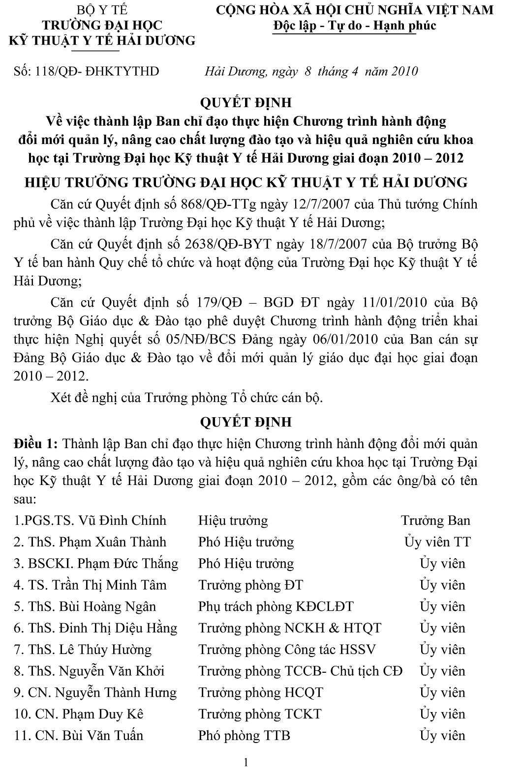 Thông báo | Quyết định thành lập ban chỉ đạo chương trình hành động (Số: 118/QĐ-ĐHKTYTHD ngày 08/04/2010)