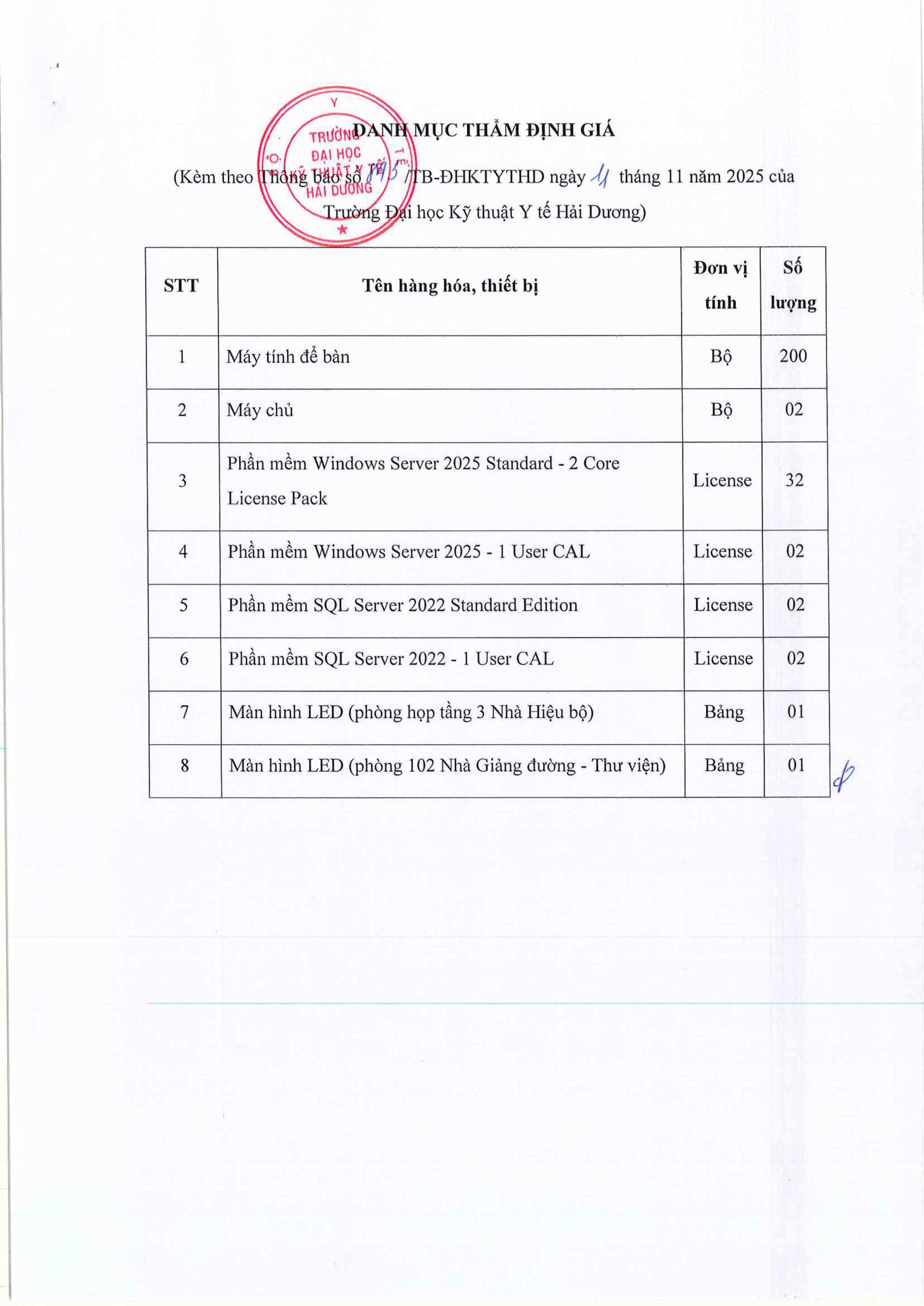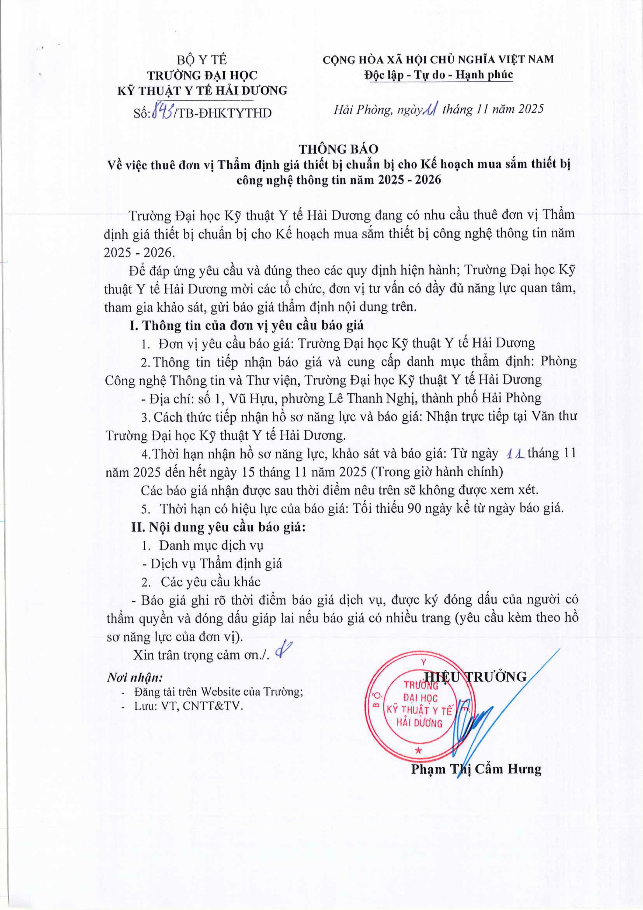 Thông báo của Trường Đại học Kỹ thuật Y tế Hải Dương về việc khảo sát, lập phương án, dự toán (báo giá) dịch vụ bảo vệ chuyên nghiệp (Số 1416/TB-ĐHKTYTHD ngày 13/11/2025) 14/11/2025 10:38' AM