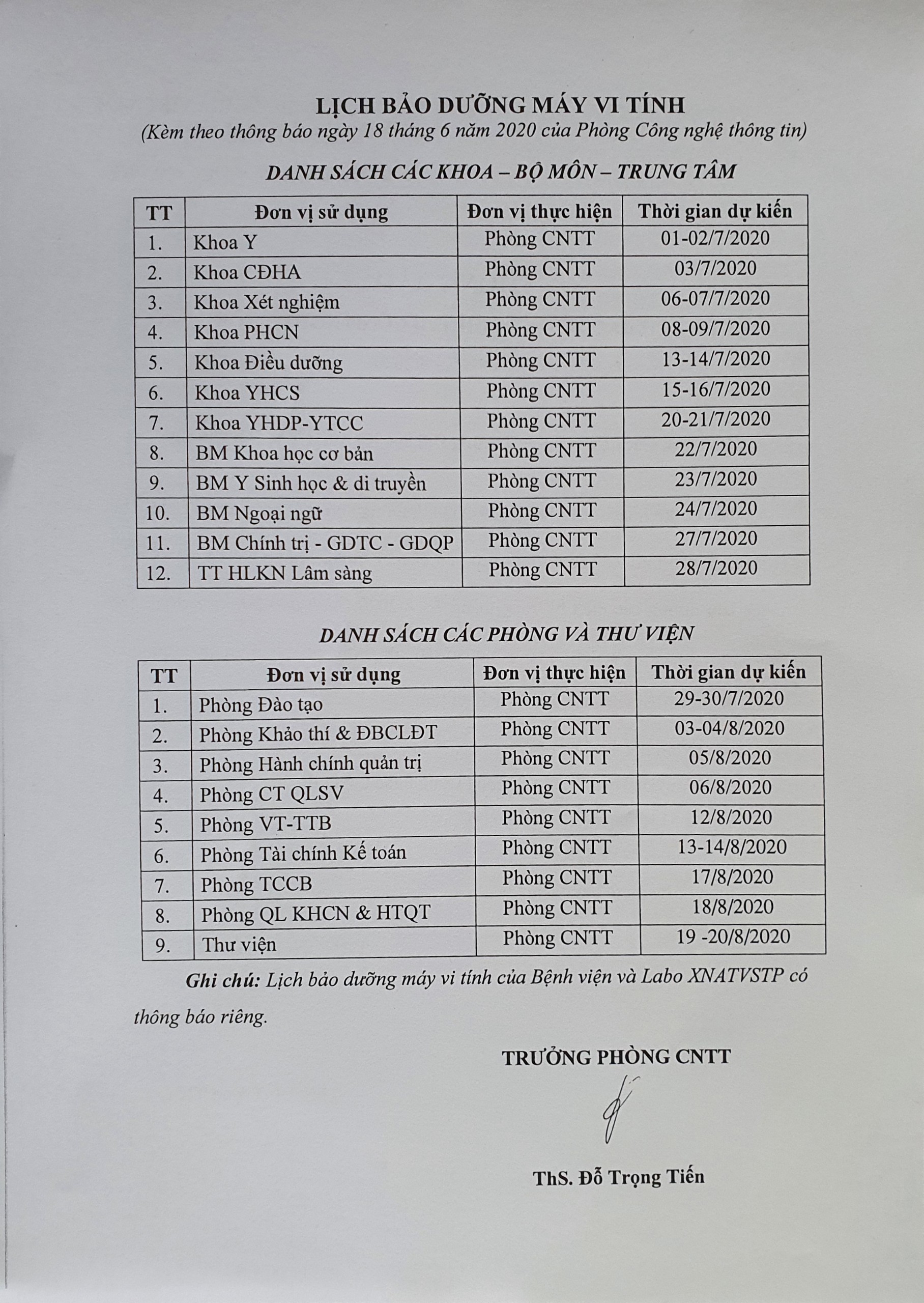 Lịch bảo dưỡng Trang thiết bị Tháng 6/2020 01/06/2020 03:31' PM