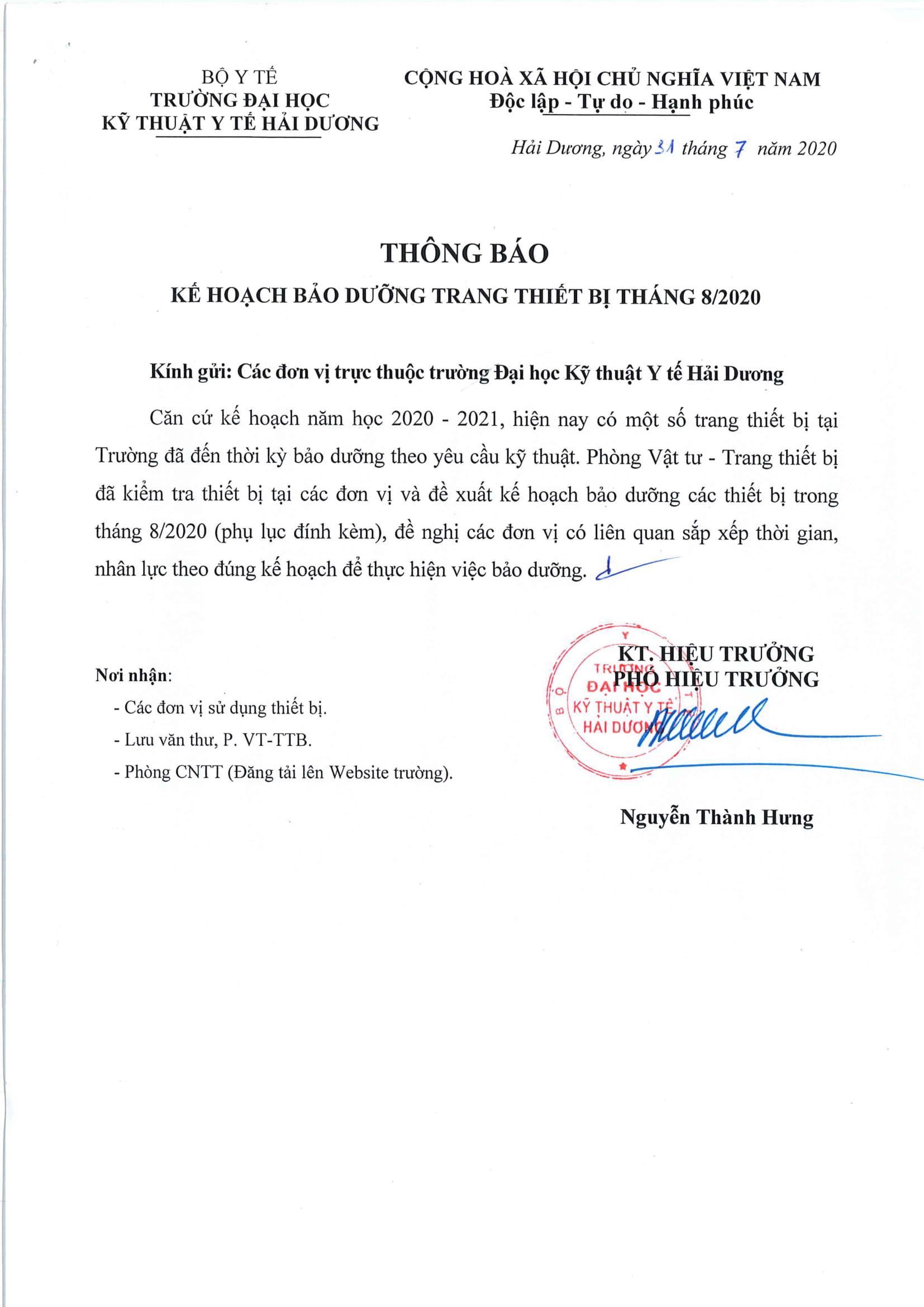 Thông báo | Thông báo kế hoạch bảo dưỡng trang thiết bị 8/2020 Số lượt đọc: