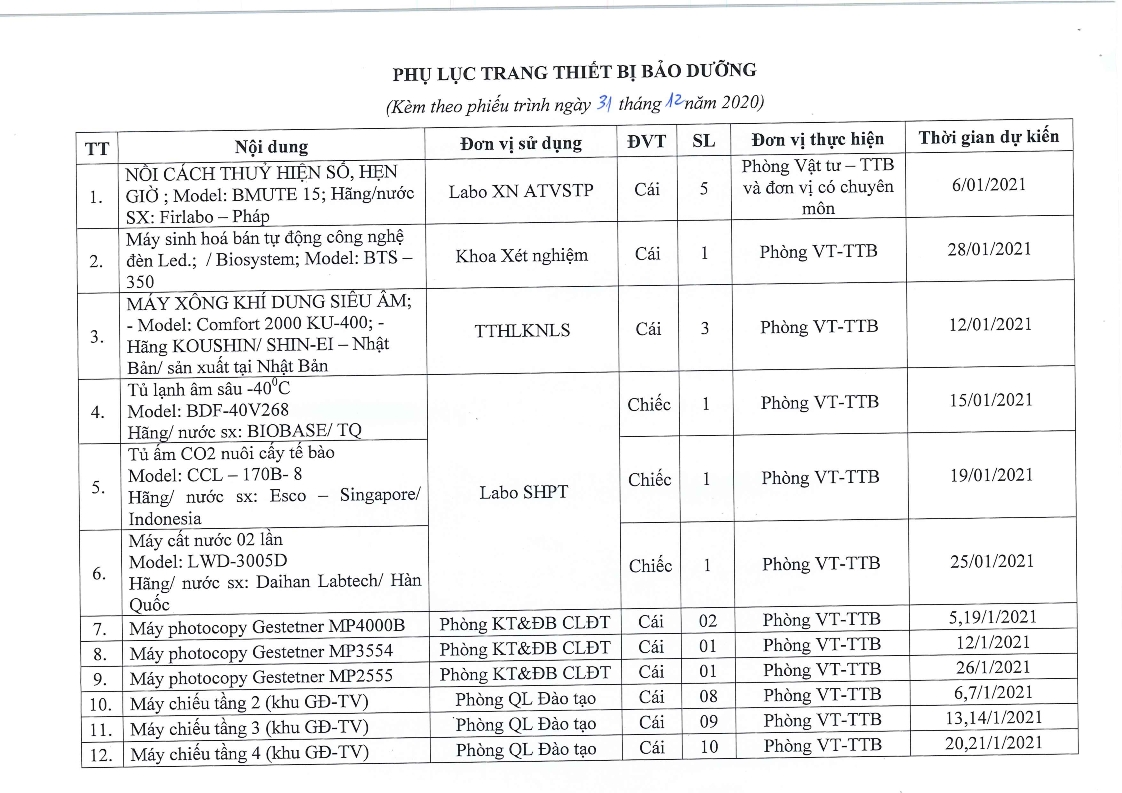 Kế hoạch bảo dưỡng trang thiết bị tháng 12/2020 27/11/2020 02:09' PM
