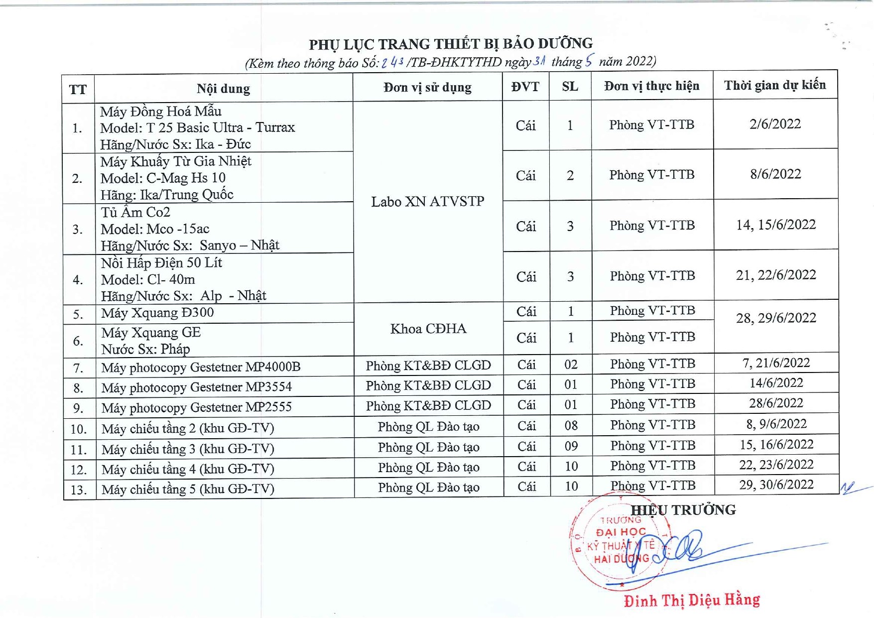 Thông báo Kế hoạch bảo dưỡng Trang thiết bị tháng 11-2025 (Số 799/TB-ĐHKTYTHD ngày 03/11/2025) 06/11/2025 08:51' AM