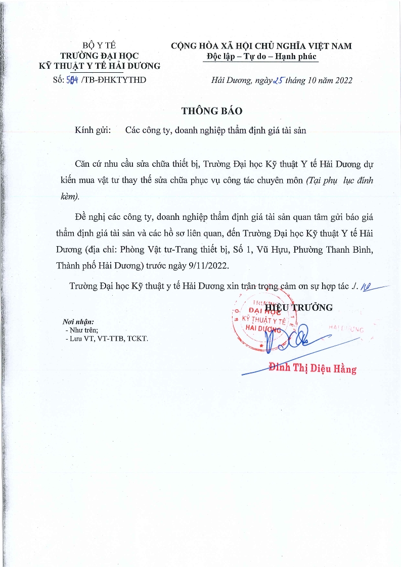| Tin đã đăng: Thông báo về việc thanh lý tài sản ( 502/TB-ĐHKTYTHD) 24/10/2022 10:22' AM
