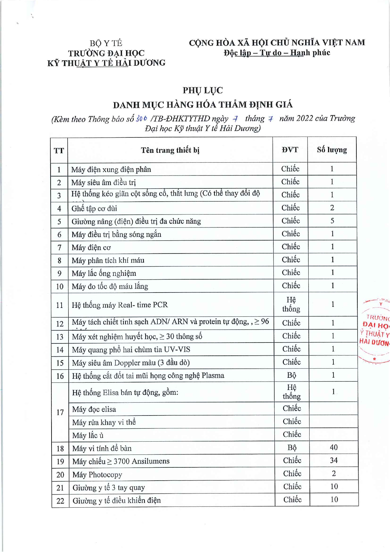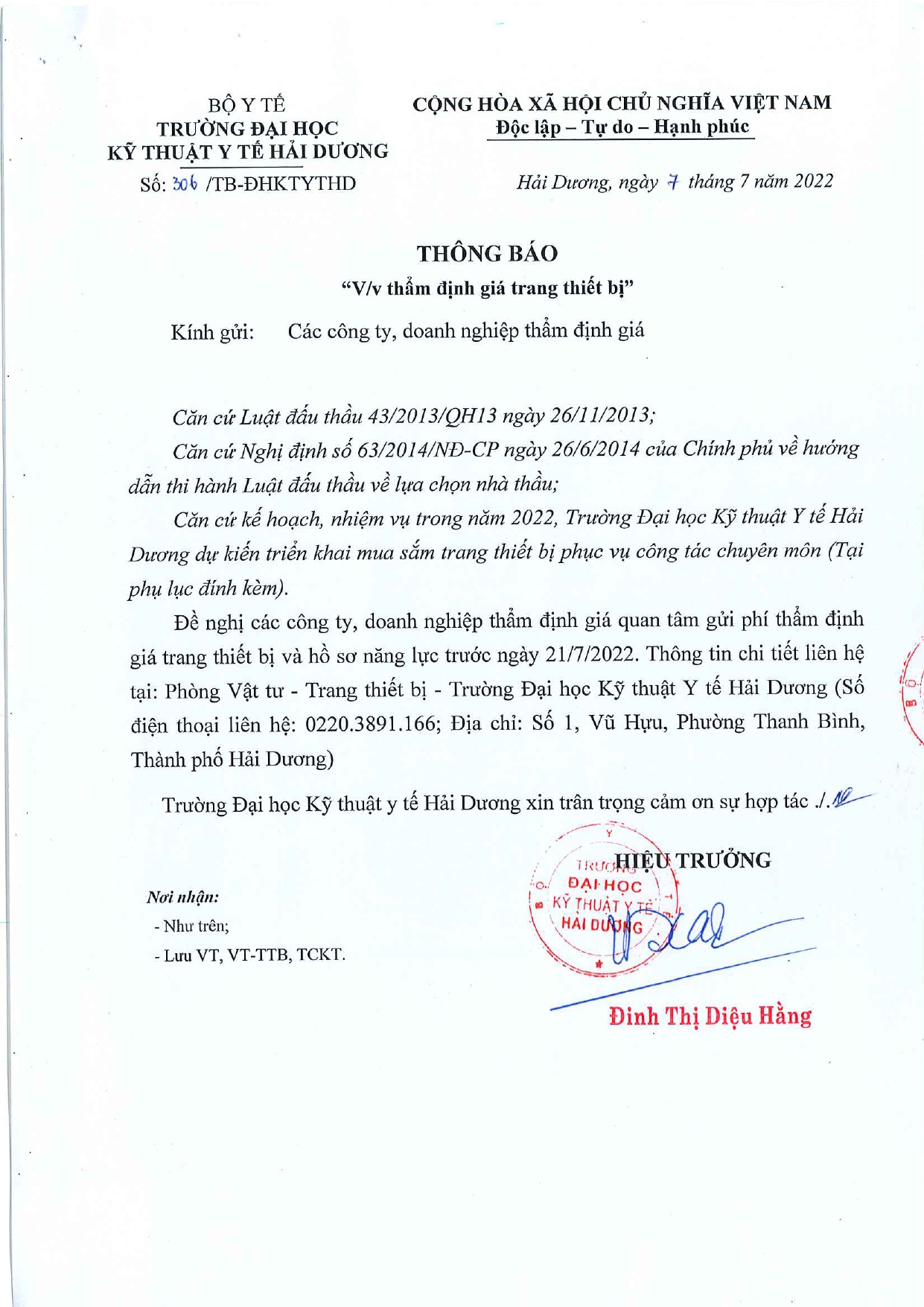 Thông báo | Thông báo về việc thẩm định giá trang thiết bị