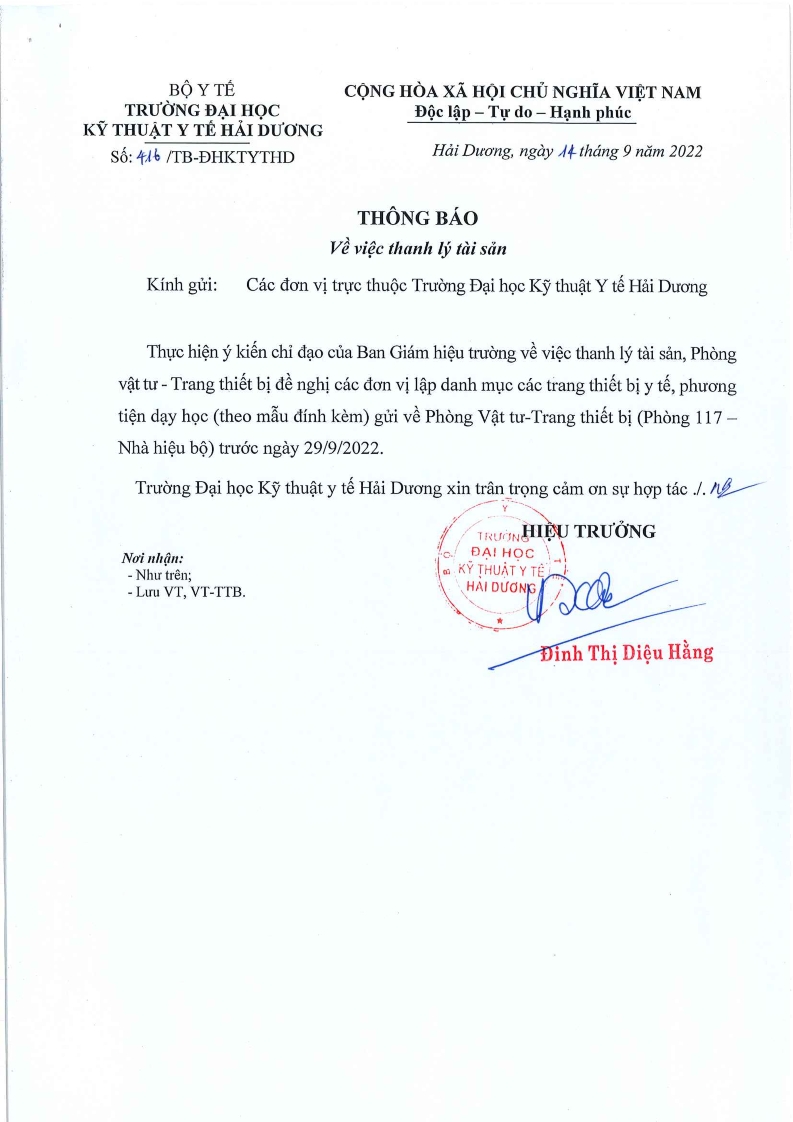 14/09/2022 10:44:22 AM | Tin mới: Thông báo của Trường Đại học Kỹ thuật Y tế Hải Dương về việc khảo sát, lập phương án, dự toán (báo giá) dịch vụ bảo vệ chuyên nghiệp (Số 1416/TB-ĐHKTYTHD ngày 13/11/2025) 14/11/2025 10:38' AM