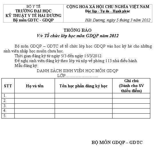 Thông báo | Thông báo về việc tổ chức môn học GDQP năm 2012 | Tin mới: Thông báo của Trường Đại học Kỹ thuật Y tế Hải Dương về việc khảo sát, lập phương án, dự toán (báo giá) dịch vụ bảo vệ chuyên nghiệp (Số 1416/TB-ĐHKTYTHD ngày 13/11/2025) 14/11/2025 10:38' AM
