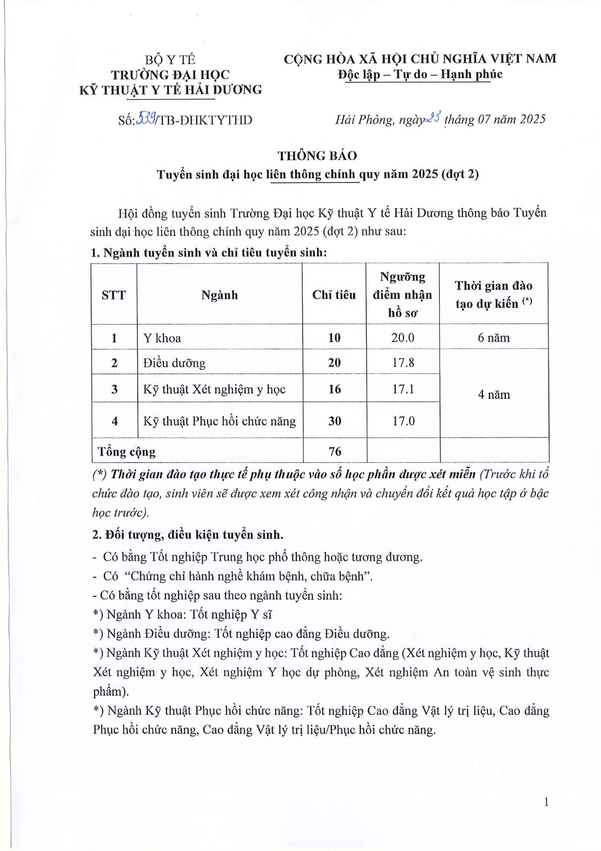 Thông báo Tuyển sinh | Thông báo tuyển sinh Đại học liên thông chính quy năm 2025 (đợt 2) (Số 539/TB-ĐHKTYTHD ngày 23/7/2025)