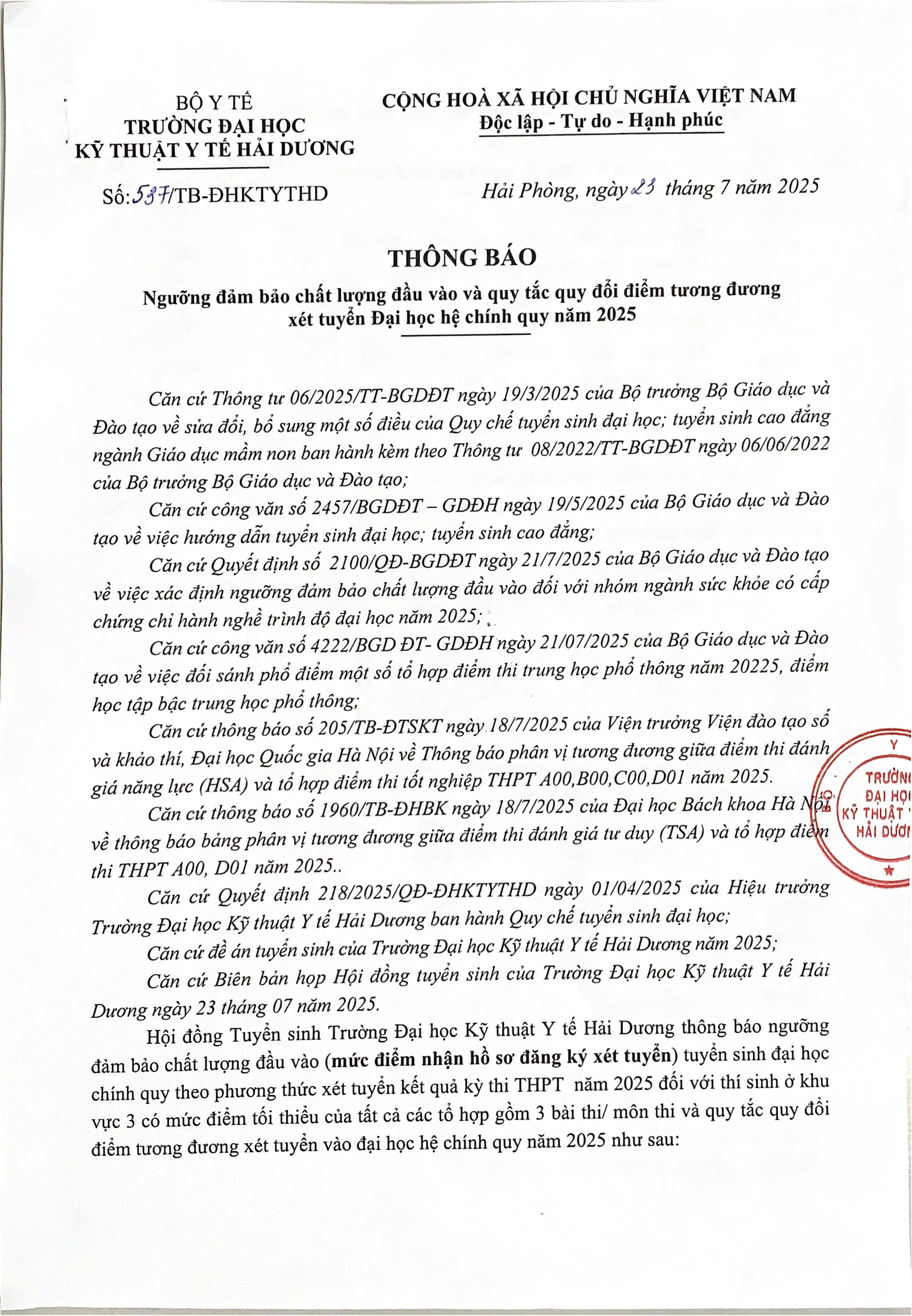 Thông báo Tuyển sinh Đại học chính qui năm 2023 (bổ sung đợt 1)23/08/2023 06:00' PM Trường đại học Kỹ thuật Y tế Hải Dương thông báo tuyển sinh đại học năm 2023 (Bố sung đợt 1) Thông báo Ngưỡng đảm bảo chất lượng đầu vào tuyển sinh đại học hệ chính quy (mức điểm nhận hồ sơ đăng ký xét tuyển) năm 2023 21/07/2023 04:00' PM