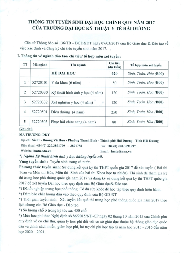 THÔNG TIN TUYỂN SINH TRÌNH ĐỘ ĐẠI HỌC NĂM 2025 10/04/2025 03:40' PM I. THÔNG TIN CHUNG: 1. Tên cơ sở đào tạo: Trường Đại học Kỹ thuật Y tế Hải Dương 2. Mã trường: DKY 3. Trụ sở: Số 01 Vũ Hựu – P. Thanh Bình - Tp.Hải Dương – Tỉnh Hải Dương 4. Địa chỉ trang thông tin điện tử: http://www.hmtu.edu.vn 5. Số điện thoại liên hệ tuyển sinh: 0220.3891.788 – 056.3291.788 6. Địa chỉ công khai quy chế tuyển sinh; Thông tin tuyển sinh 6.1. Đường link công khai Thông tin tuyển sinh trên trang thông tin điện tử của Trường: http://hmtu.edu.vn/Desktop.aspx/Tin-tuc/De-an-tuyen-sinh/ 6.2. Đường link công khai Quy chế tuyển sinh của cơ sở đào tạo trên trang thông tin điện tử của Trường: http://hmtu.edu.vn/Desktop.aspx/Cac-hoat-dong-khac/Quy-dinh-quy-che/ 6.3. Đường link công khai Quy chế thi tuyển sinh trên trang thông tin điện tử của Trường: http://hmtu.edu.vn/Desktop.aspx/Cac-hoat-dong-khac/Quy-dinh-quy-che/ 6.4. Đường link công khai Đề án tổ chức thi trên trang thông tin điện tử của Trường: http://hmtu.edu.vn/Desktop.aspx/Cac-hoat-dong-khac/Quy-dinh-quy-che/ 7. Địa chỉ công khai các thông tin về hoạt động của Trường: 7.1. Đường link công khai việc làm của sinh viên sau khi tốt nghiệp trên trang thông tin điện tử của Trường: http://hmtu.edu.vn/Desktop.aspx/Chi-tiet/Hoat-dong-khao-sat/Bao_cao_ket_qua_khao_sat_tinh_hinh_viec_lam_sinh_vien_tot_nghiep_2024/ 7.2. Đường link công khai thông tin về tuyển sinh chính quy của 2 năm gần nhất trên trang thông tin điện tử của Trường: http://hmtu.edu.vn/Desktop.aspx/Tin-tuc/Thong-tin-tuyen-sinh-chinh-quy/ 7.3. Đường link công khai danh mục ngành được phép đào tạo trên trang thông tin điện tử của Trường: http://hmtu.edu.vn/Desktop.aspx/Chi-tiet/Chuyen-nganh-dao-tao/ 7.4. Đường link công khai các điều kiện đảm bảo chất lượng trên trang thông tin điện tử của Trường: http://hmtu.edu.vn/Desktop.aspx/Gioi-thieu/Noi-dung-cong-khai/