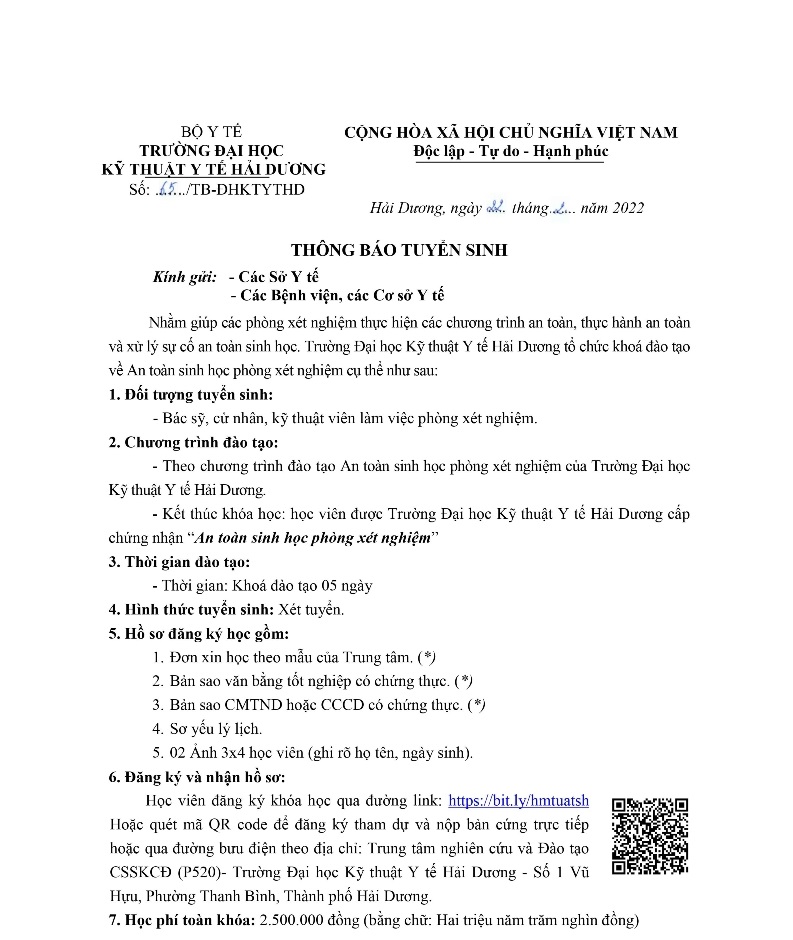 09/03/2022 03:19:08 PM | Tin mới: Thông báo về việc Tuyển sinh Đào tạo liên tục năm 2023 (số 526/CV-ĐHKTYTHD ngày 14/9/2023) 16/09/2023 08:03' AM