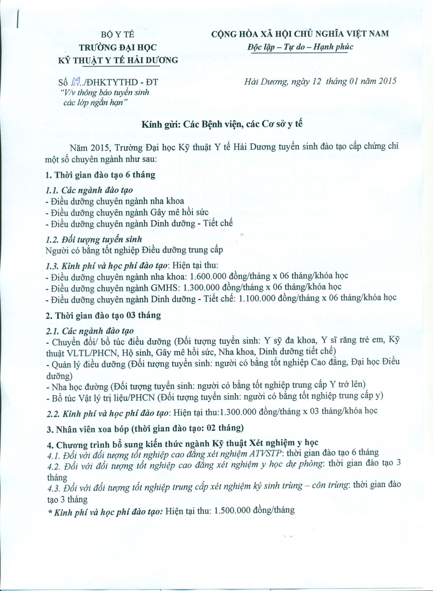 12/01/2015 04:34:40 PM | Tin mới: Thông báo về việc Tuyển sinh Đào tạo liên tục năm 2023 (số 526/CV-ĐHKTYTHD ngày 14/9/2023) 16/09/2023 08:03' AM
