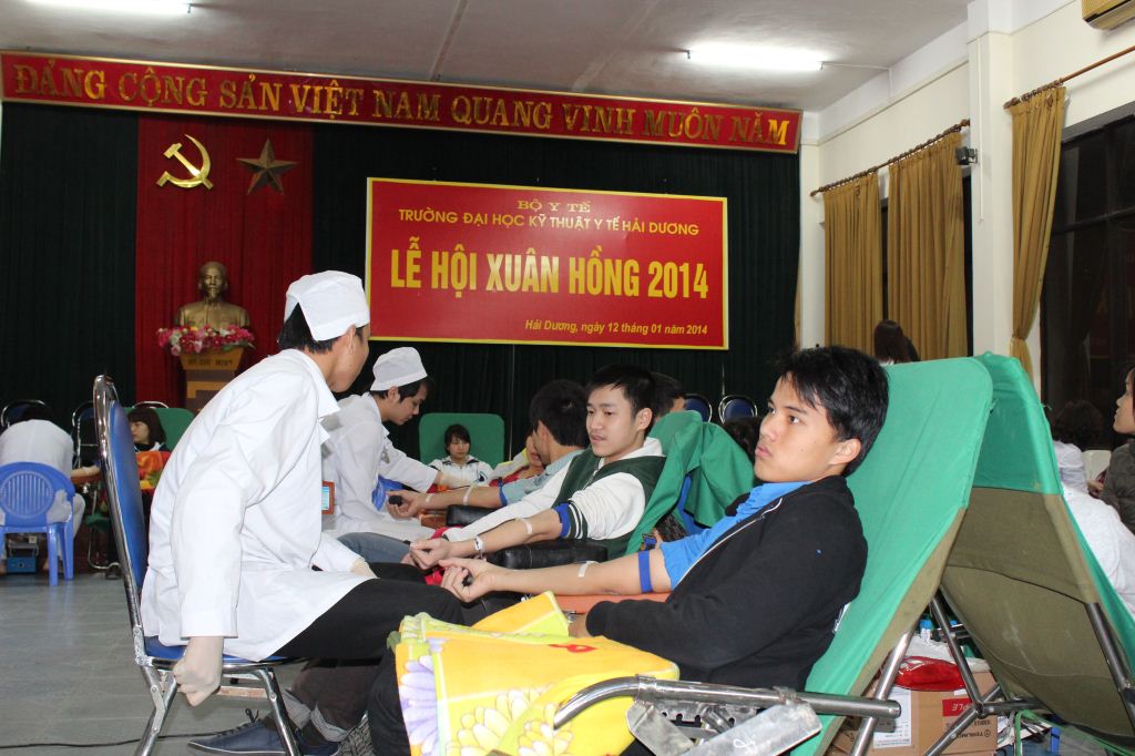 Hưởng ứng “Lễ hội Xuân hồng” năm 2014 và thiết thực chào mừng ngày truyền thống sinh viên Việt Nam, ngày 12/01/2014, Đoàn thanh niên – Hội sinh viên, Phòng Công tác học sinh sinh viên Trường Đại học Kỹ thuật Y tế Hải Dương đã phối hợp với Hội Chữ thập đỏ tỉnh và Bệnh viện đa khoa tỉnh Hải Dương tổ chức chương trình hiến máu tình nguyện. Với tinh thần “Sẻ giọt máu đào, trao niềm hy vọng” sinh viên Trường Đại học Kỹ thuật Y tế Hải Dương là đơn vị đầu tiên tại Hải Dương tổ chức “ngày chủ nhật đỏ” với hơn 400 học sinh sinh viên tham gia hiến máu. Tính đến 17 giờ cùng ngày Ban tổ chức đã thu được 392 đơn vị máu. Đây là nghĩa cử cao đẹp mang tính nhân văn sâu sắc của HSSV Trường Đại học Kỹ thuật Y tế Hải Dương nhằm giúp cho các bệnh nhân cấp cứu và điều trị tại các bệnh viện.